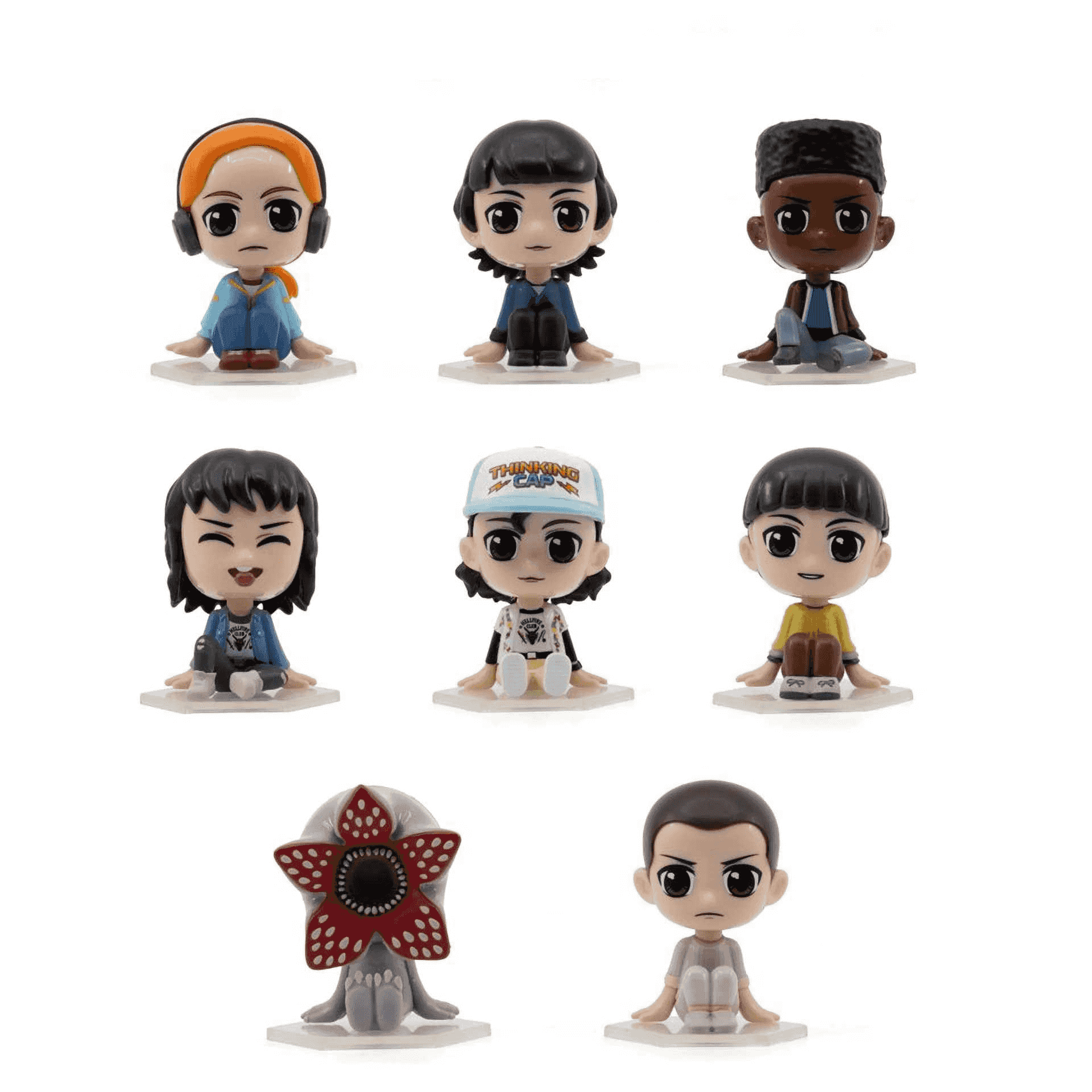 - Estilo retro: Figuras en posición sentada con detalles cuidados y colores vibrantes que capturan la esencia de la serie ambientada en los años 80.