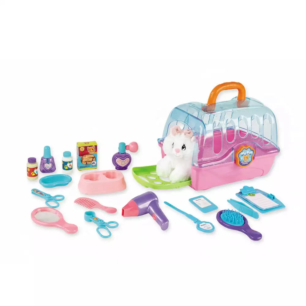 - Contenido: transportín, peluche de mascota, cepillo, tijeras, peine, espejo, secador, comedero, frascos simulados, accesorios veterinarios y más.