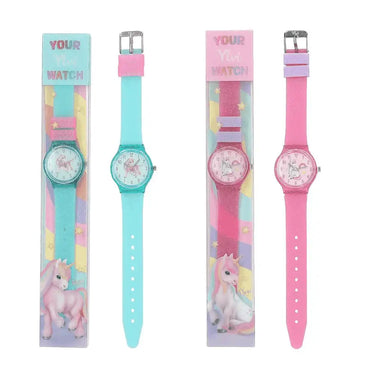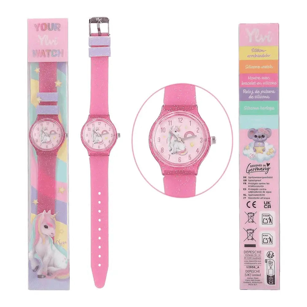 El reloj Ylvi de silicona es perfecto para niñas desde los 5 años que quieran aprender la hora con un toque mágico. Viene en modelos surtidos: uno en rosa y otro en turquesa, ambos con purpurina y la imagen del unicornio Naya. ¡No sabrás cuál te toca hasta que lo abras!