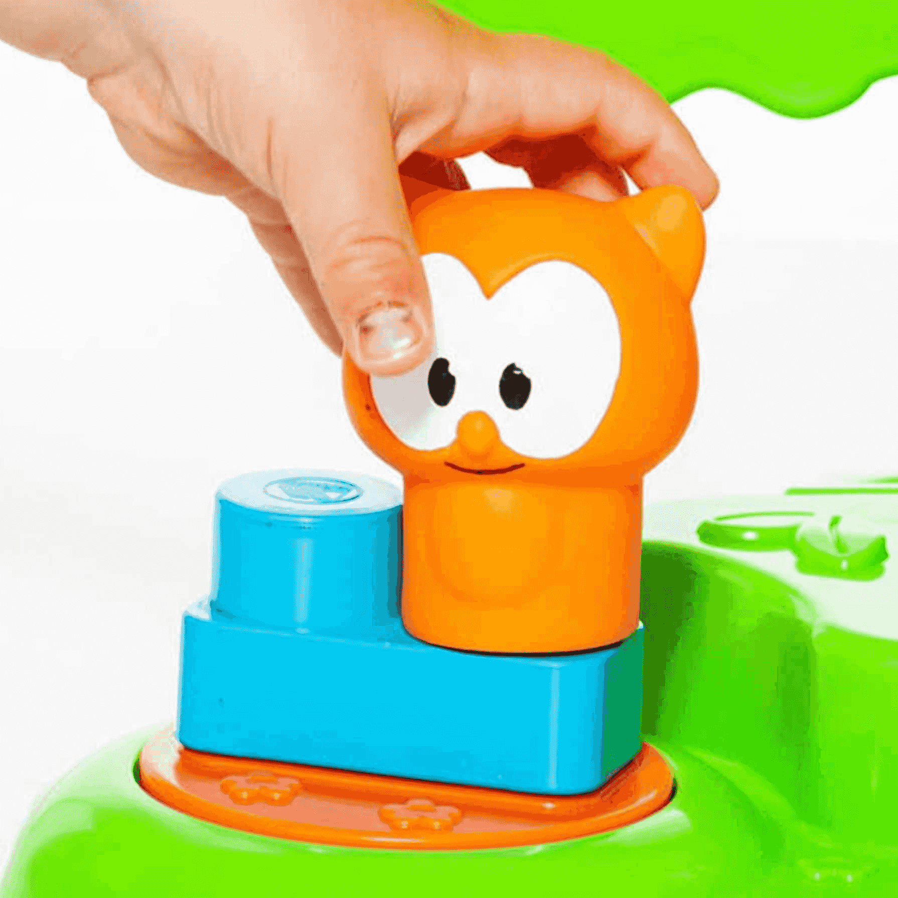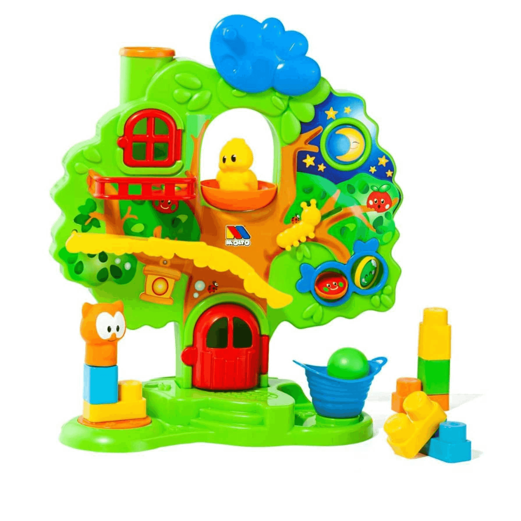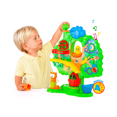 Todo el árbol posee tonalidades muy coloridas que harán del juguete algo muy atractivo para los más pequeños. Incluye un pato de juguete, un búho, 6 bloques para construir y 2 pelotas. El árbol requiere de pilas para la emisión de sonidos y las diferentes canciones.