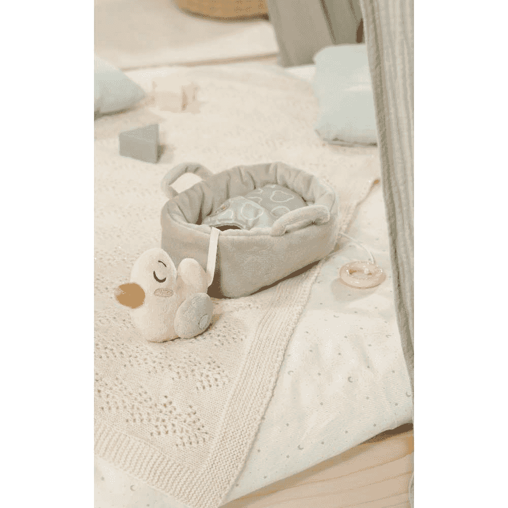 Berta está diseñada con materiales suaves y un formato compacto, perfecto para que los bebés puedan tenerla cerca en sus primeros meses. Su forma de pequeño nido acolchado aporta una sensación reconfortante.