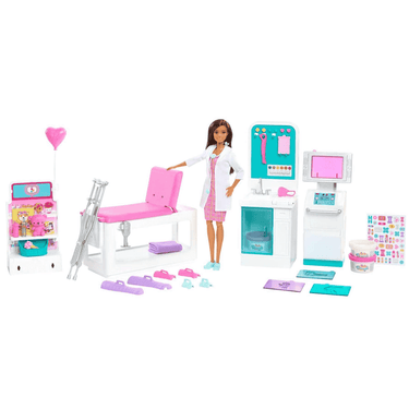 ¡Invita a tus hijos e hijas a explorar el divertido mundo de Barbie! Cuando los niños y niñas juegan con muñecas Barbie ponen a volar su imaginación y con la Barbie Doctora con Clínica Médica amarán cuidar de los demás y podrán dirigir un consultorio clínico. Esta pequeña clínica incluye una muñeca Barbie doctora morena, diversas áreas de juego y accesorios de atención médica para los pacientes.