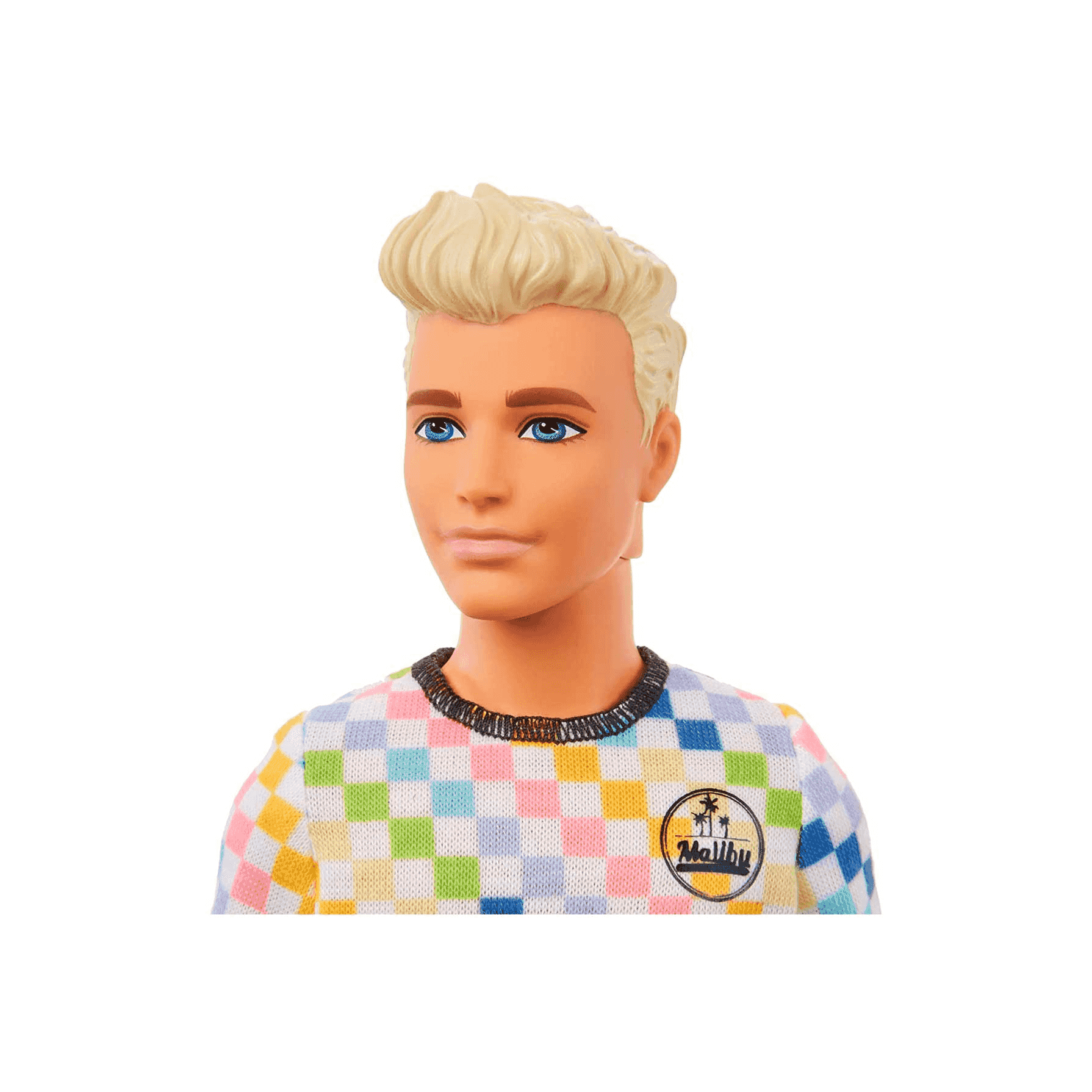 Ken rubio con camiseta de cuadros colorida de Malibu.