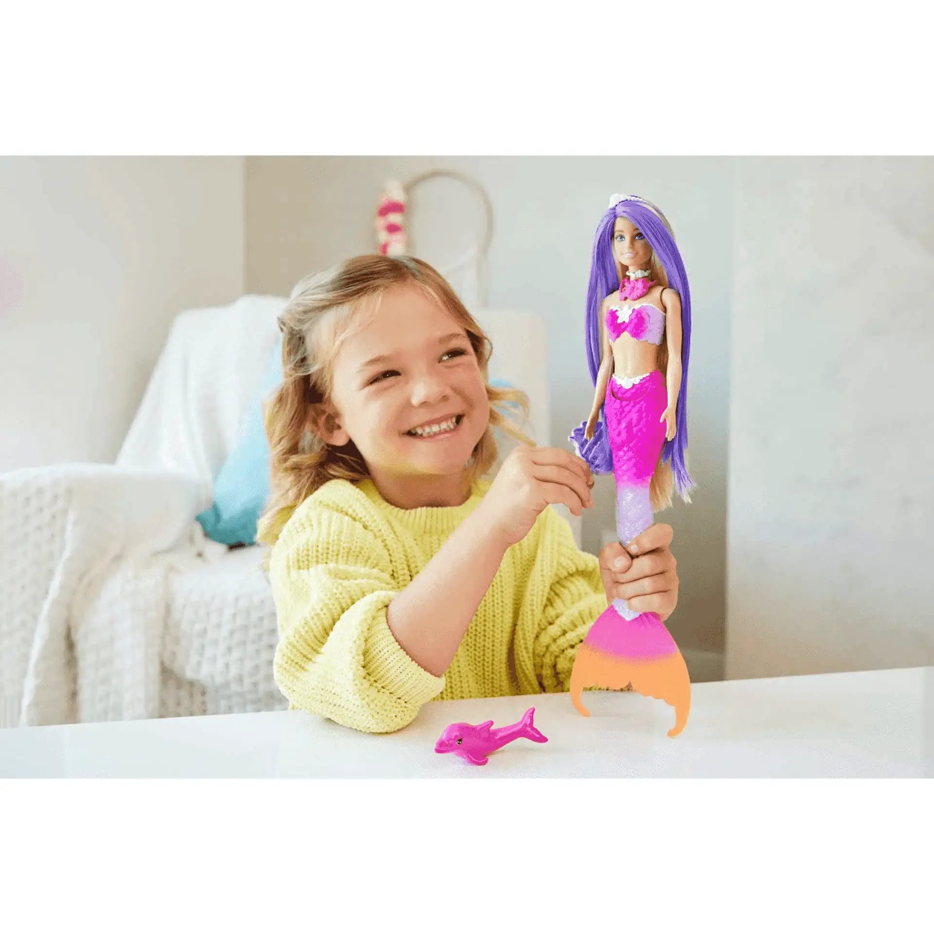 La Barbie Sirena Malibú de la serie Un toque de magia convierte el tiempo de juego en una experiencia mágica. Esta increíble muñeca cambia de color cuando se sumerge en agua fría o caliente, transformando su melena, corpiño y cola de colores rosados a tonos púrpura vibrante.