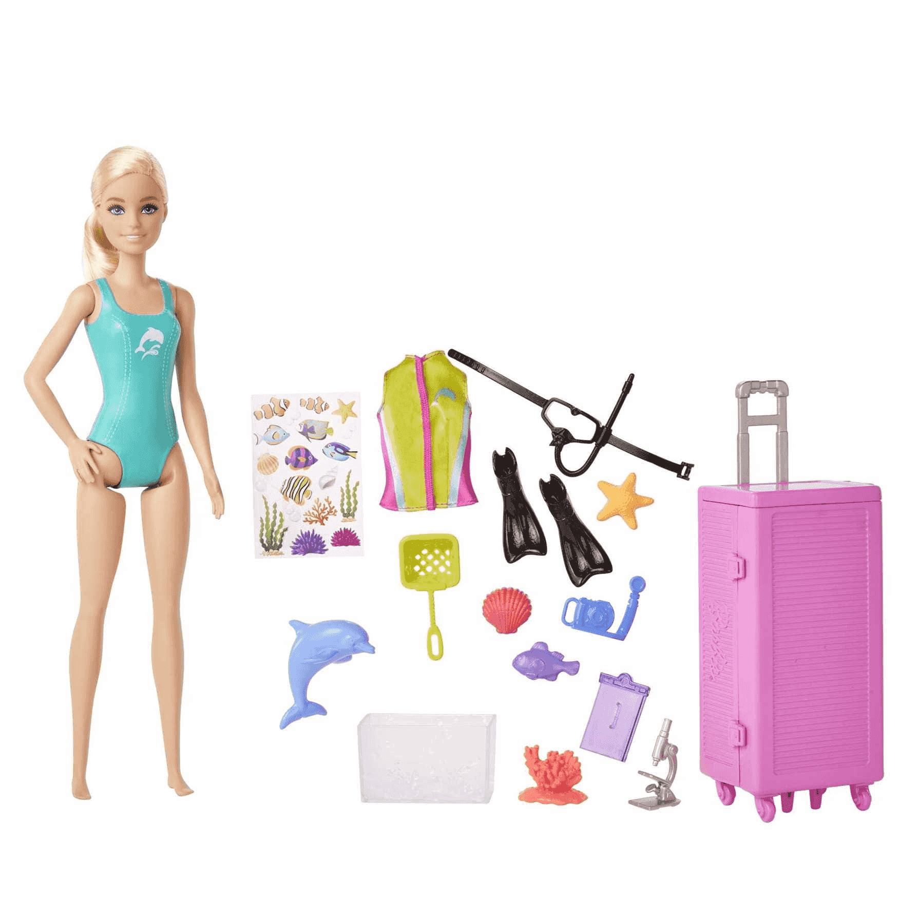 Incluye 1 muñeca Barbie, 1 laboratorio móvil de ciencias con almacenamiento, 1 chaleco de natación, 1 máscara de buceo y aletas, 1 delfín, 1 pez, 1 estrella de mar, 1 coral, 1 concha, 1 acuario, 1 red, 1 microscopio, 1 portapapeles, 1 cámara y 1 hoja de pegatinas.