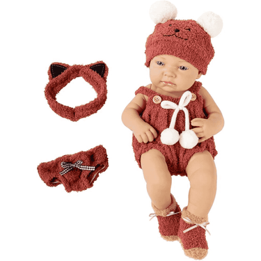 1 muñeco bebé de 33 cm con conjunto de animalito y complementos textiles.