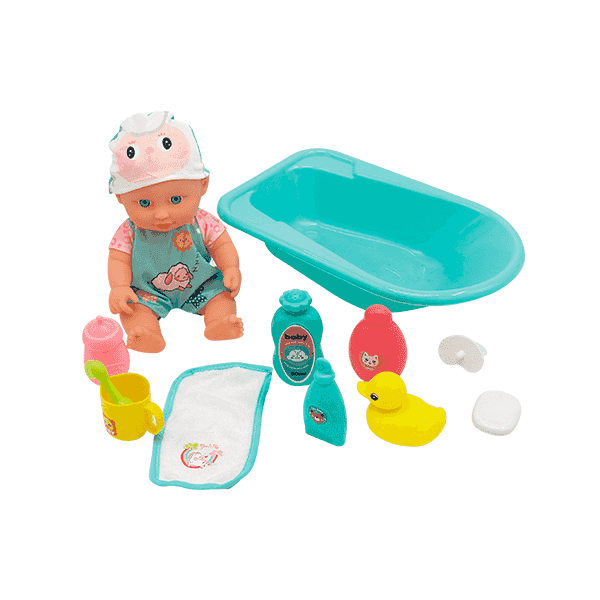 ¿Qué es y qué incluye? Este set incluye un bebé articulado con ropita y gorrito, una bañerita, biberón, patito de goma, botellitas simuladas de gel y champú, toallita, taza, cepillo, pastilla de jabón y otros pequeños accesorios para recrear el momento del baño. Todo lo necesario para que el peque se sienta como un auténtico cuidador o cuidadora. Colores surtidos: azul o rosa. No se puede elegir modelo al realizar la compra.