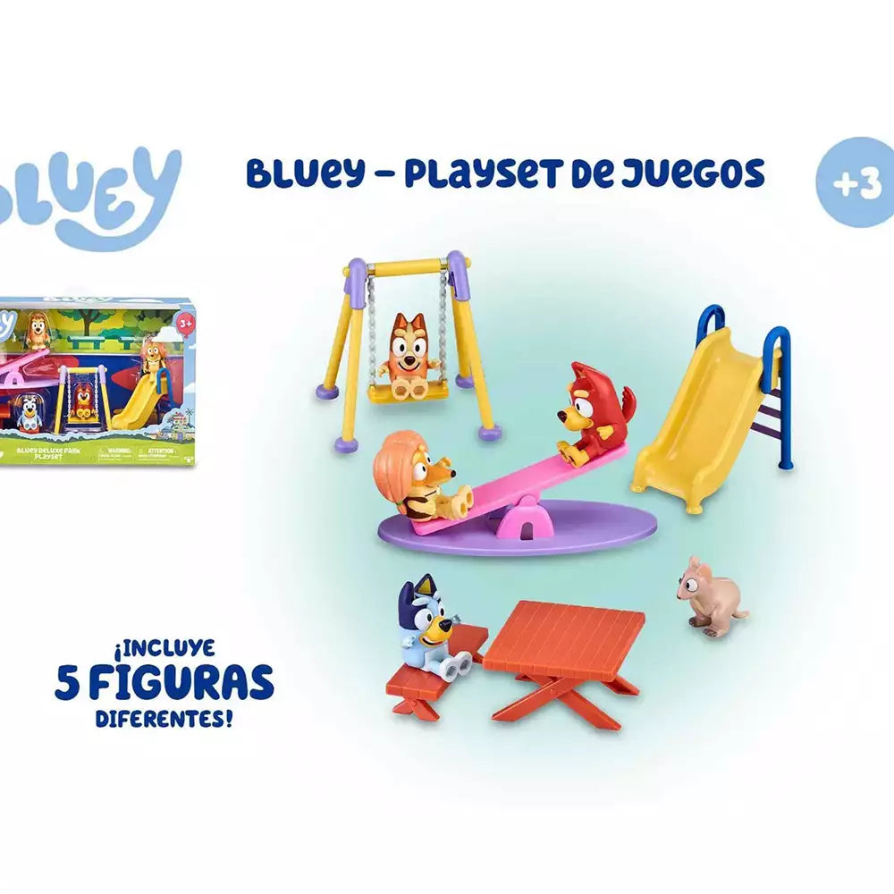 Con el Playset Deluxe Parque de Bluey, puedes recrear un día de aventuras en el parque con Bluey y sus amigos. Incluye columpio, tobogán, balancín giratorio, mesa con banquetas y cinco figuras articuladas (Bluey, Bingo, Rusty, Indy y Potaroo). Perfecto para niñas y niños desde los 3 años.