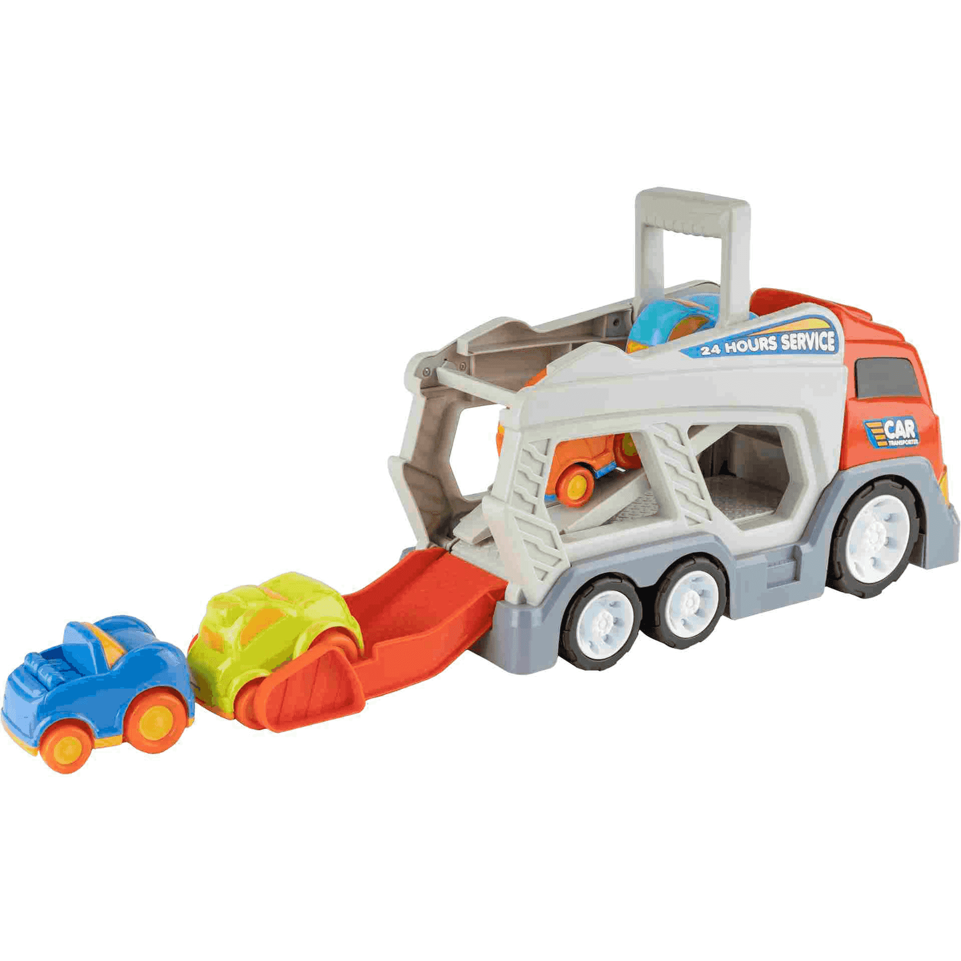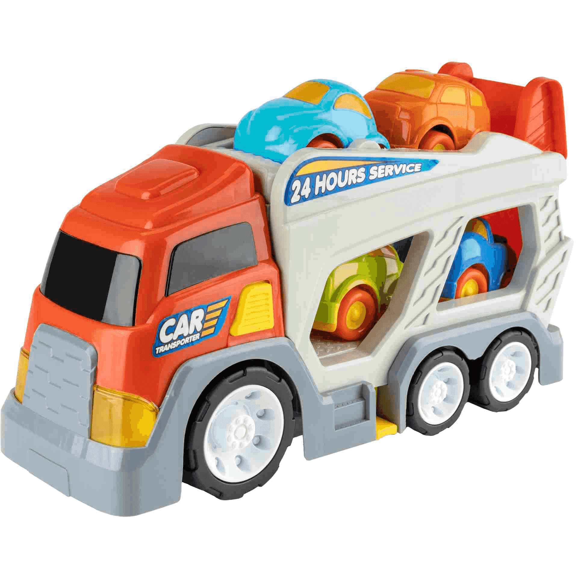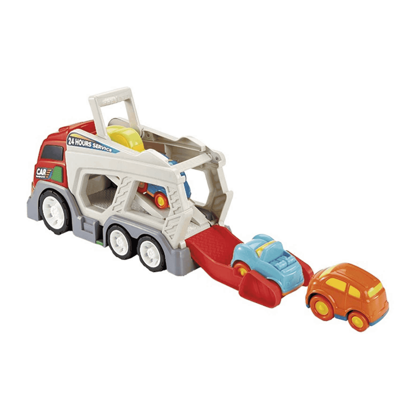 El dispositivo tiene 24.2 cm de largo, 42.7 de ancho y 15.5 de altura. Consta de un juego de 4 cochecitos desmontables e integrados en compartimentos dentro del camión. El juguete posee una rampa plegable que permite el acceso de los coches a la parte trasera del camión transportador. Se ha procurado en gran medida mantener elementos realistas, pero se ha elaborado en colores llamativos para estimular los sentidos de los pequeños y pequeñas.