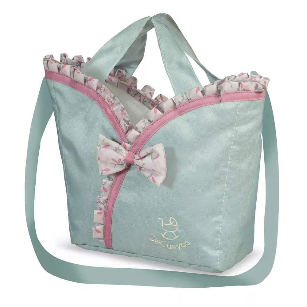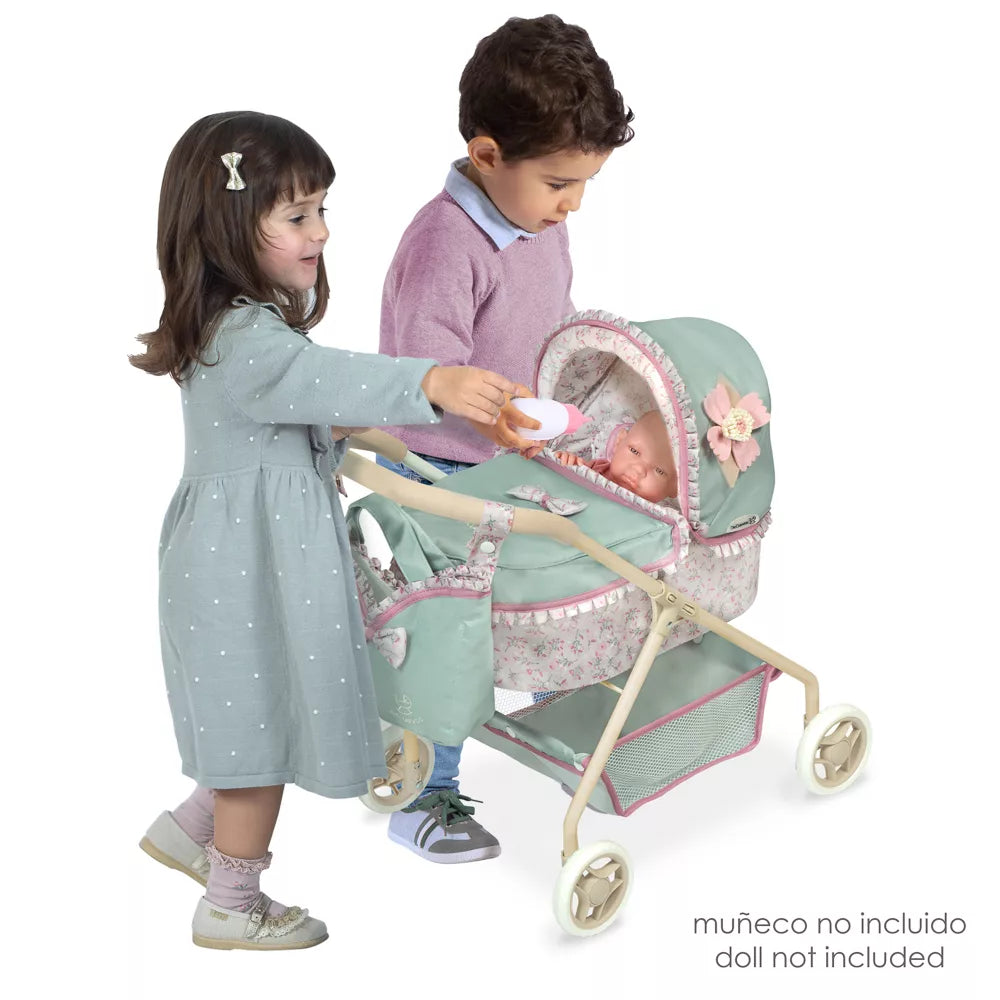 El pack incluye: Carro de muñecas de color rosa, azul y blanco con bandeja portaobjetos de tela, colchón, almohada y bolso infantil a juego con el carrito.