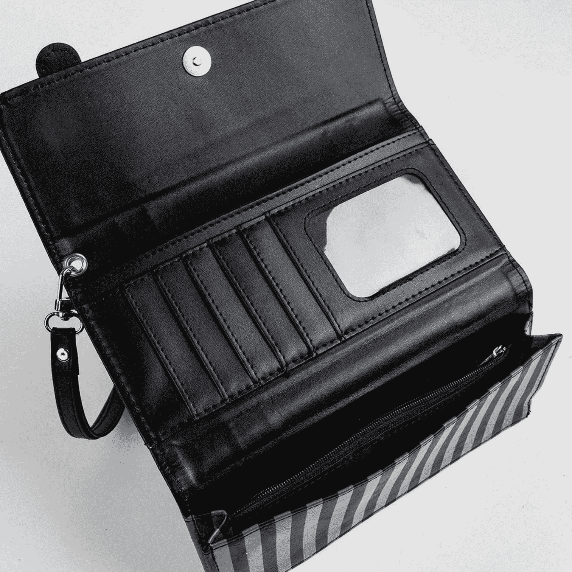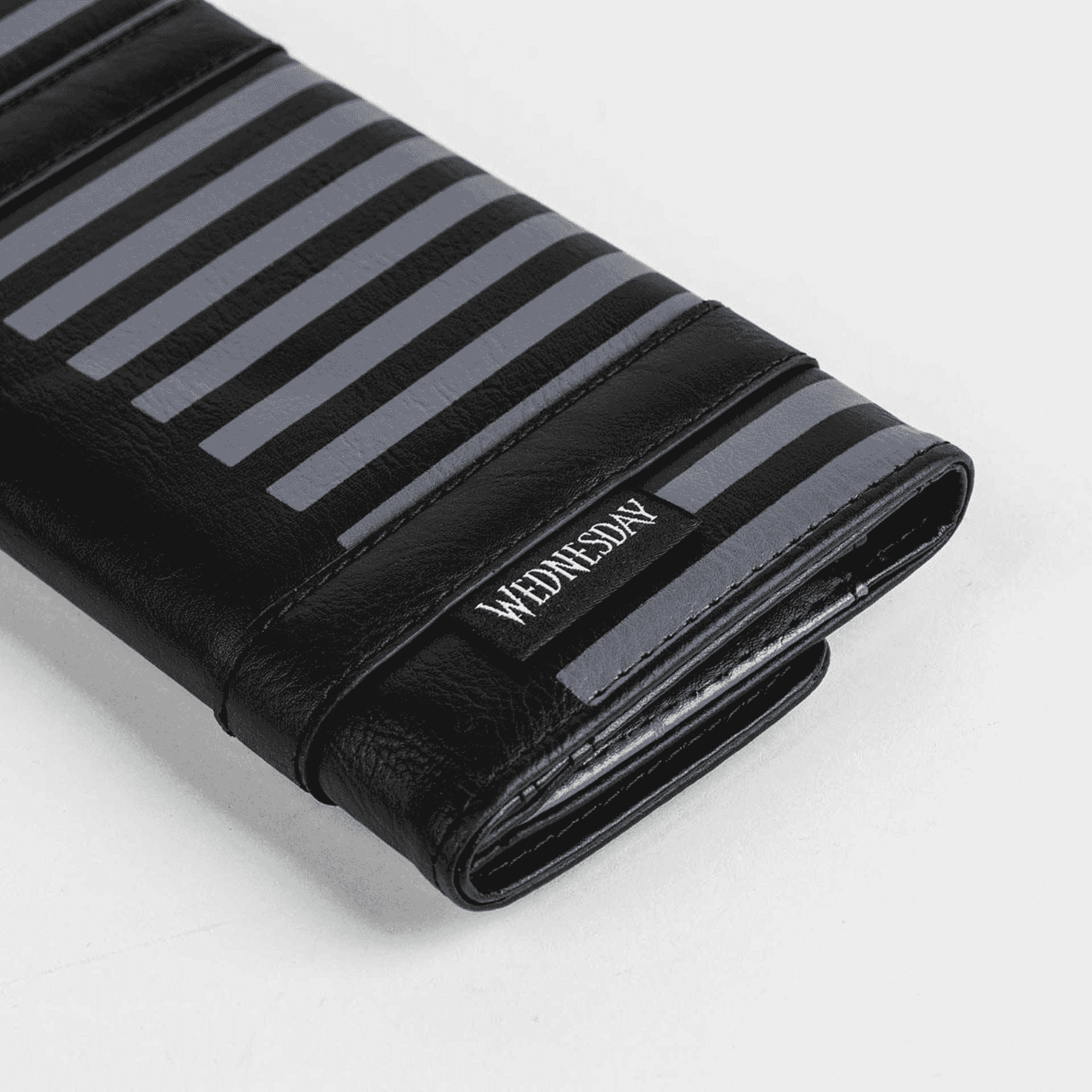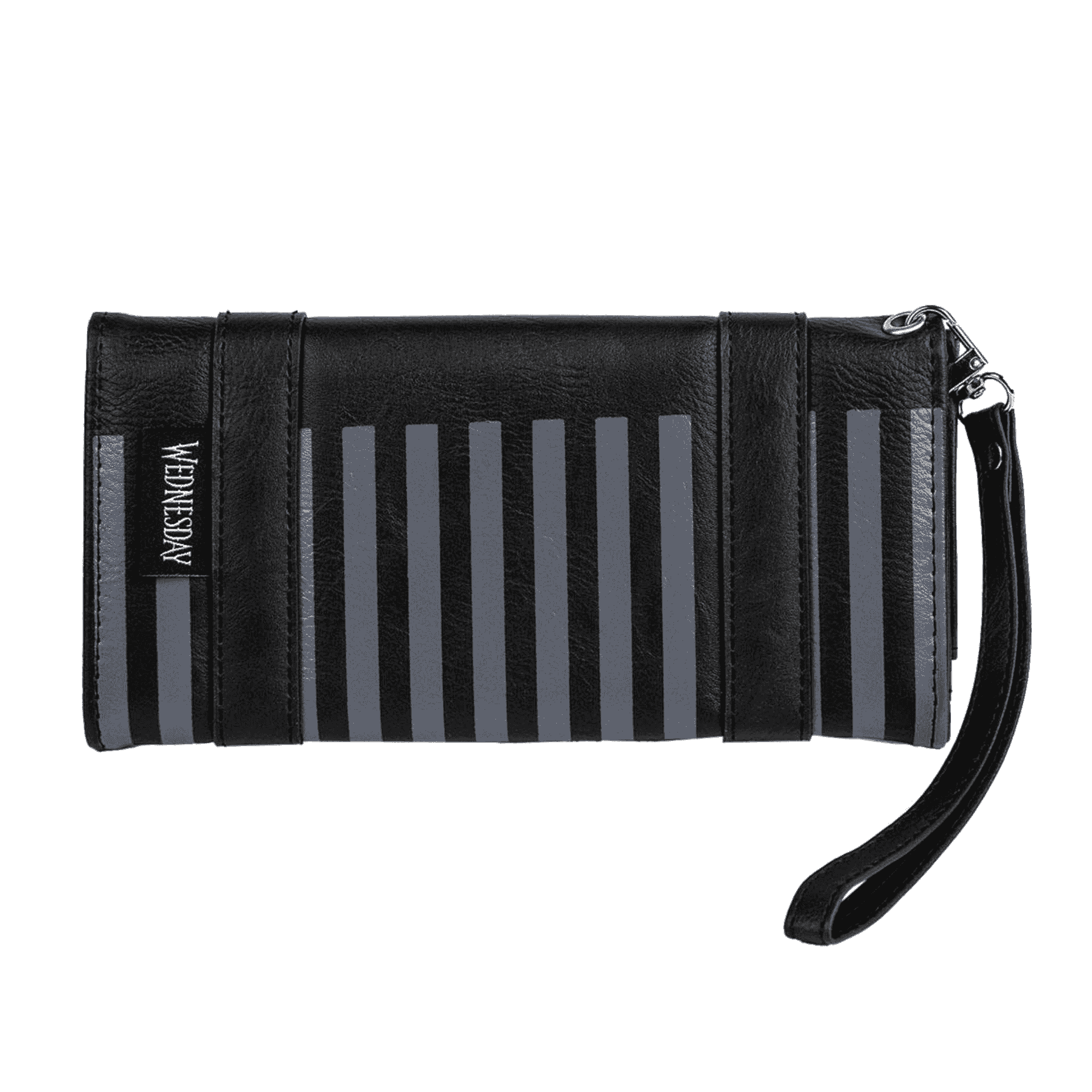El diseño presenta detalles que evocan la estética gótica de Wednesday, con tonos oscuros y un estilo minimalista que encaja perfectamente con la moda alternativa. La cartera cuenta con compartimentos interiores que permiten organizar diferentes objetos, como tarjetas y dinero en efectivo, y un cierre seguro con cremallera para mantener tus pertenencias protegidas.