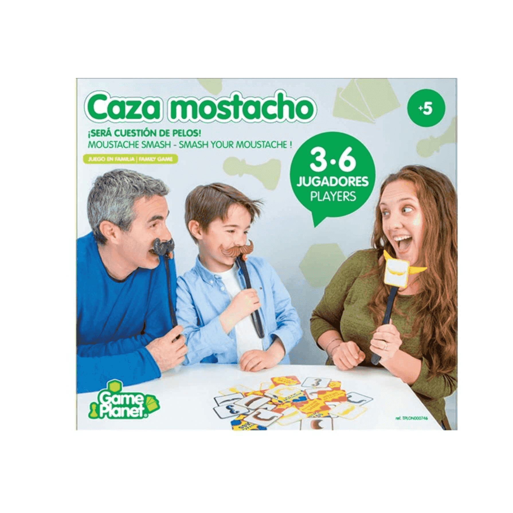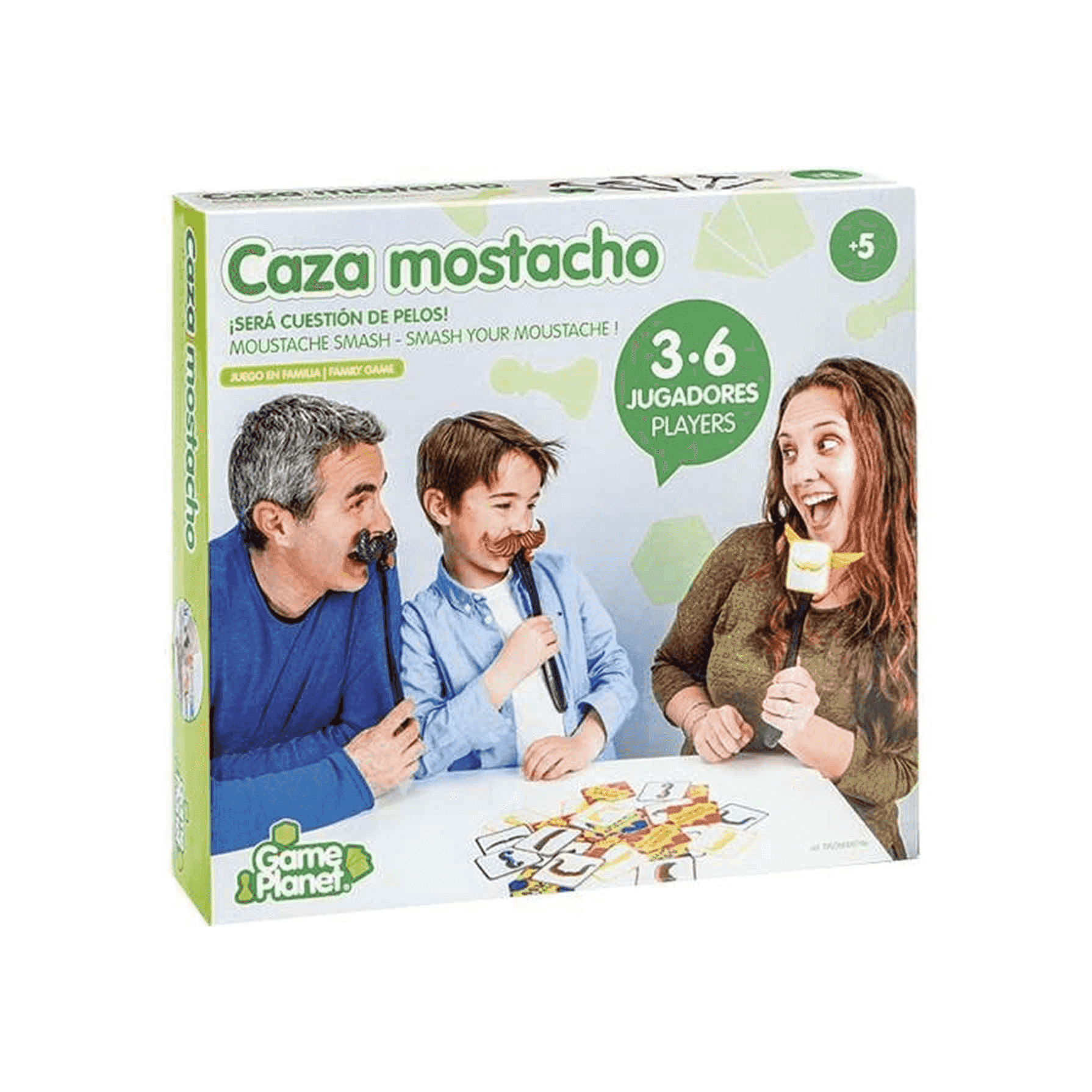 ¡Busca tu bigote y llévate el bote! En el divertido juego de mesa Caza Mostacho, tendrás que ser rápido para atrapar la carta que coincida con tu bigote. Con 6 Mostachos con palo y 32 Cartas de Mostacho, podrás disfrutar de horas de diversión en familia o con amigos.