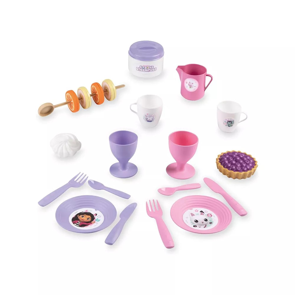 - 2 juegos de platos, cuchillos, tenedores y cucharas en colores pastel, con ilustraciones de personajes como Gabby y Kitty Fairy.