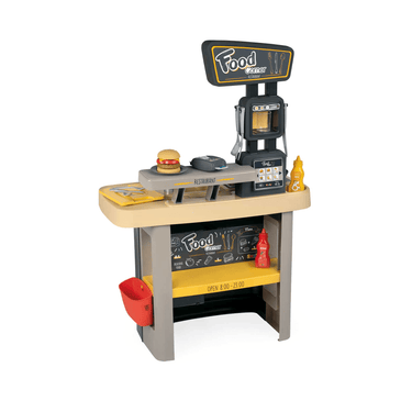 Incluye un módulo de 63 x 95,50 x 38,80 cm que tiene una cocina de juguete integrada con fogones, freidora, una cafetera, un horno y un frigorífico. Por el otro lado, tiene un área para los clientes que incluye el menú, el terminal de pedidos falso, el dispensador de bebidas falso y una bandeja de salida y retorno para pedir. También incluye 29 accesorios de distintos tamaños. Los accesorios no tienen sonido ni luces.