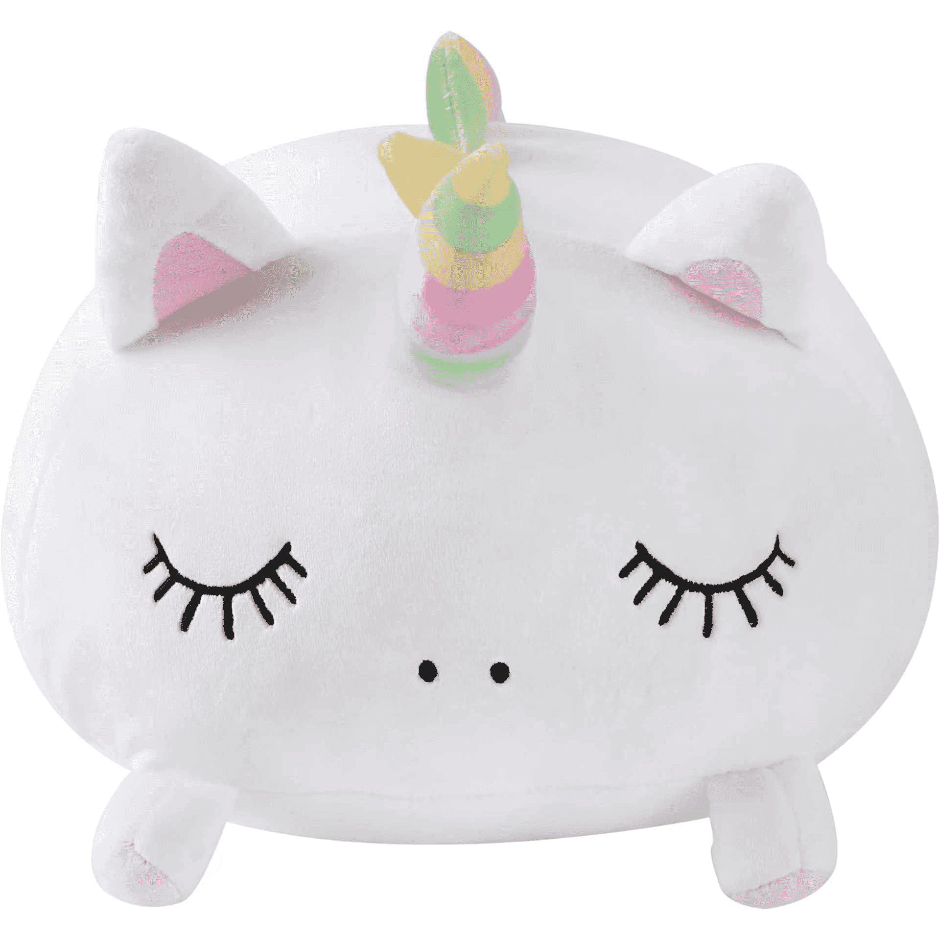 - Diseño encantador: Con forma de unicornio sonriente y orejitas suaves, este cojín da un toque de ternura instantáneo.