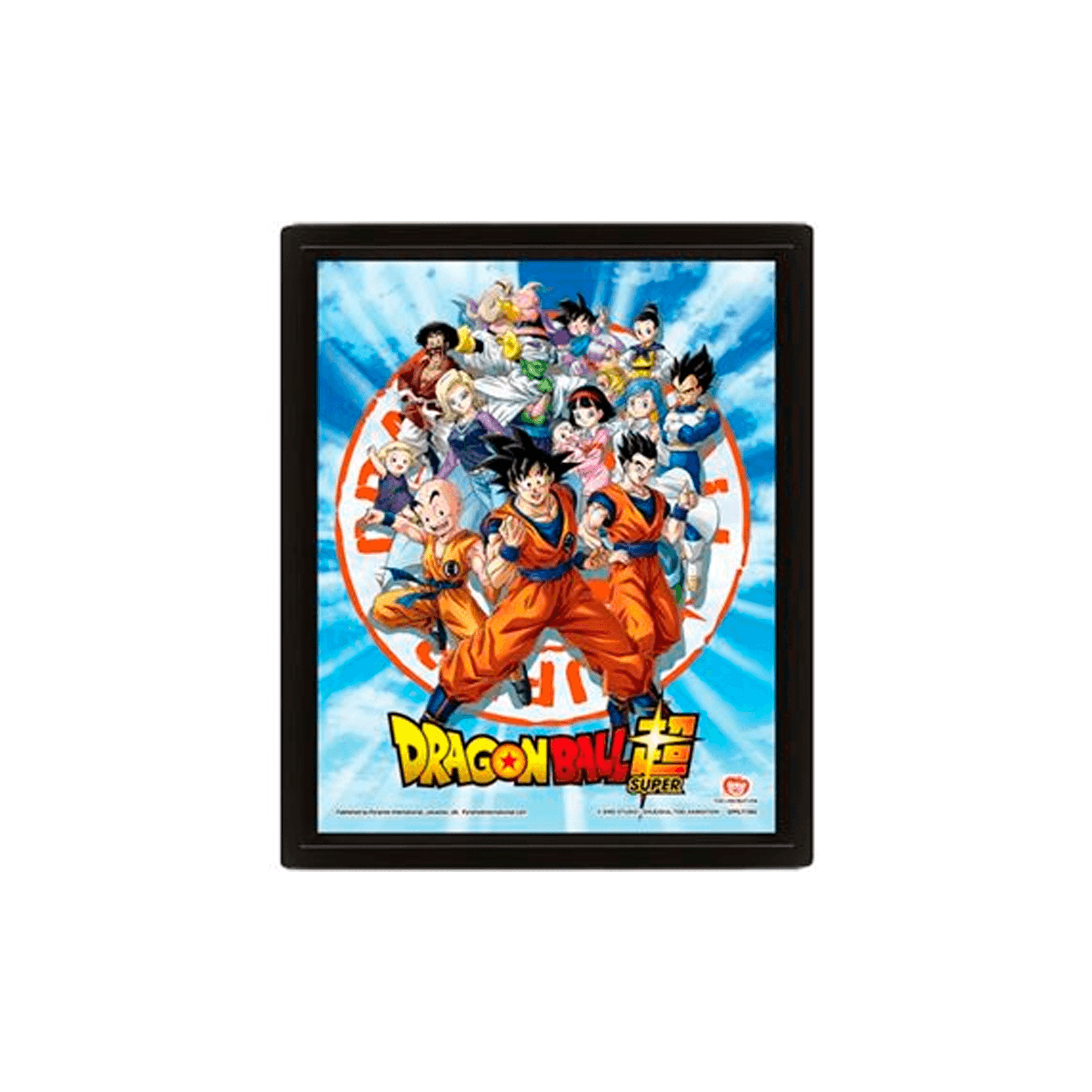 El Cuadro 3D ´Z Fighters´ de Dragon Ball Super es una pieza imprescindible para los fanáticos de la serie. Este póster lenticular muestra a los personajes principales de la saga, como Goku, Vegeta, Gohan y otros guerreros Z, en una épica escena grupal.