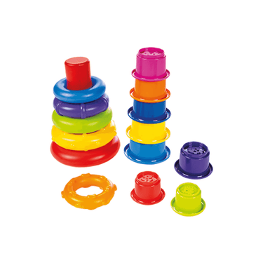 ¡Descubre este alegre conjunto de cubos y anillas apilables que será el perfecto compañero de juego para tus hijos! Este juguete no solo proporcionará horas de diversión, sino que también ayudará a tus pequeños a identificar colores y a desarrollar su coordinación y habilidad manual.