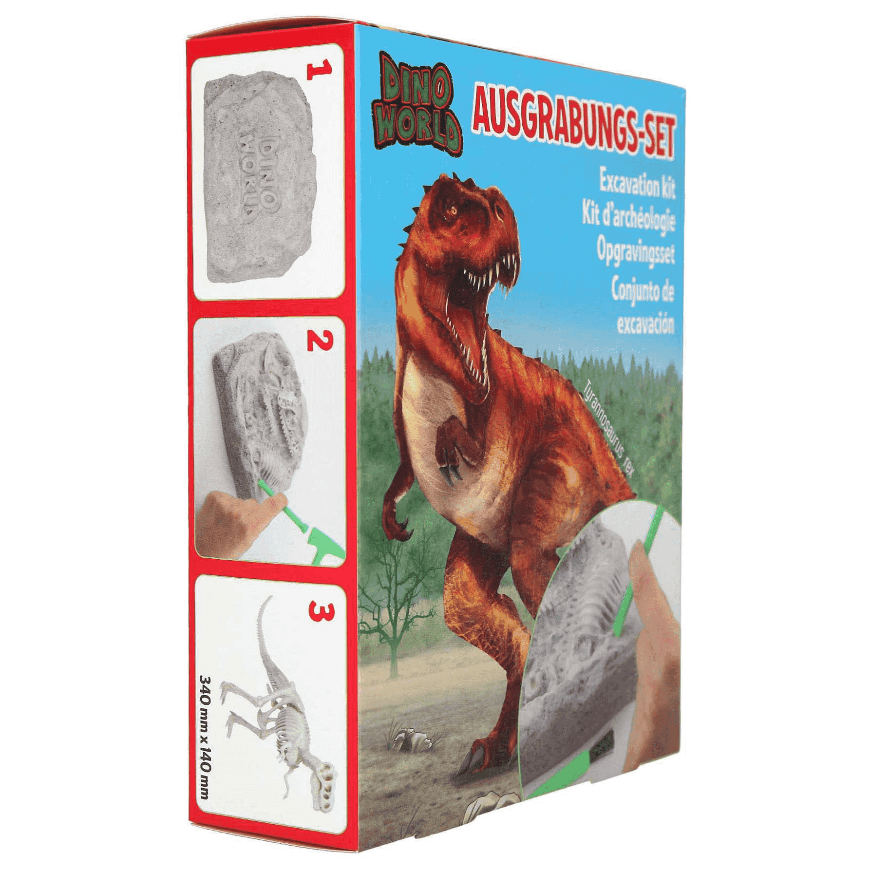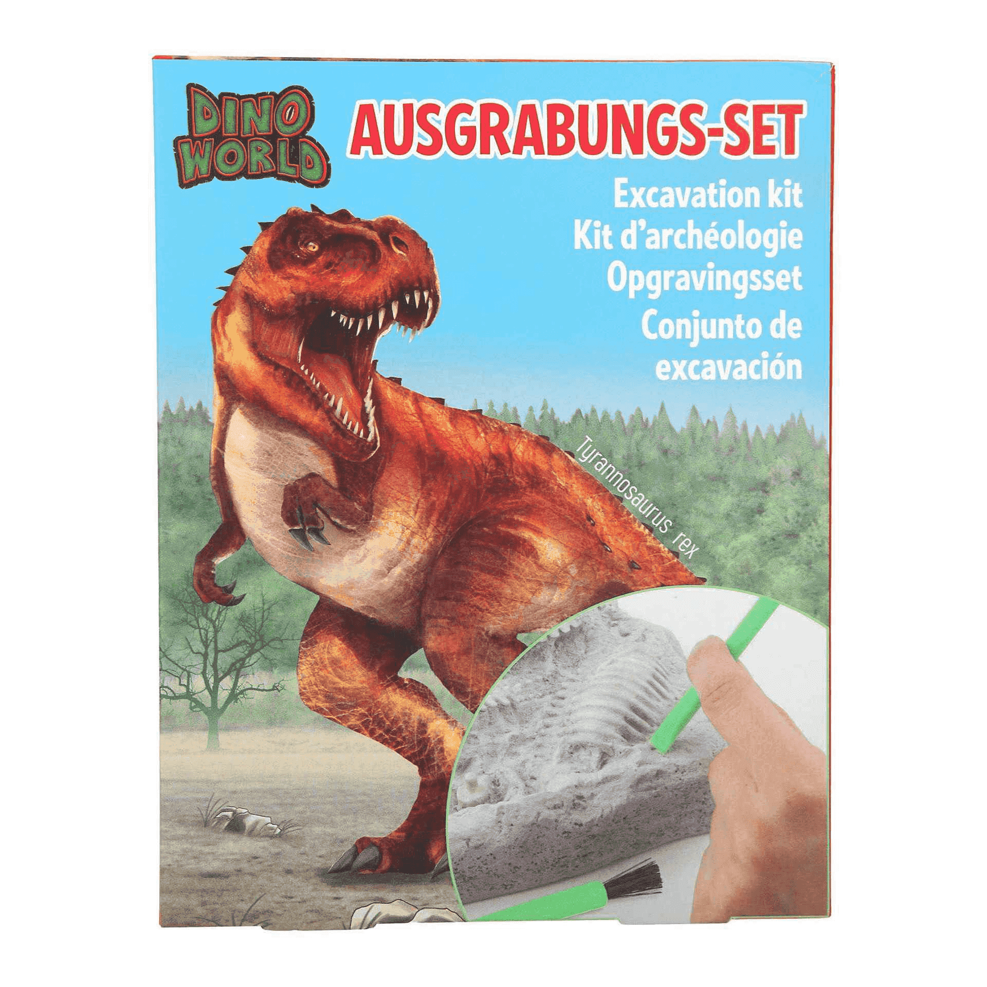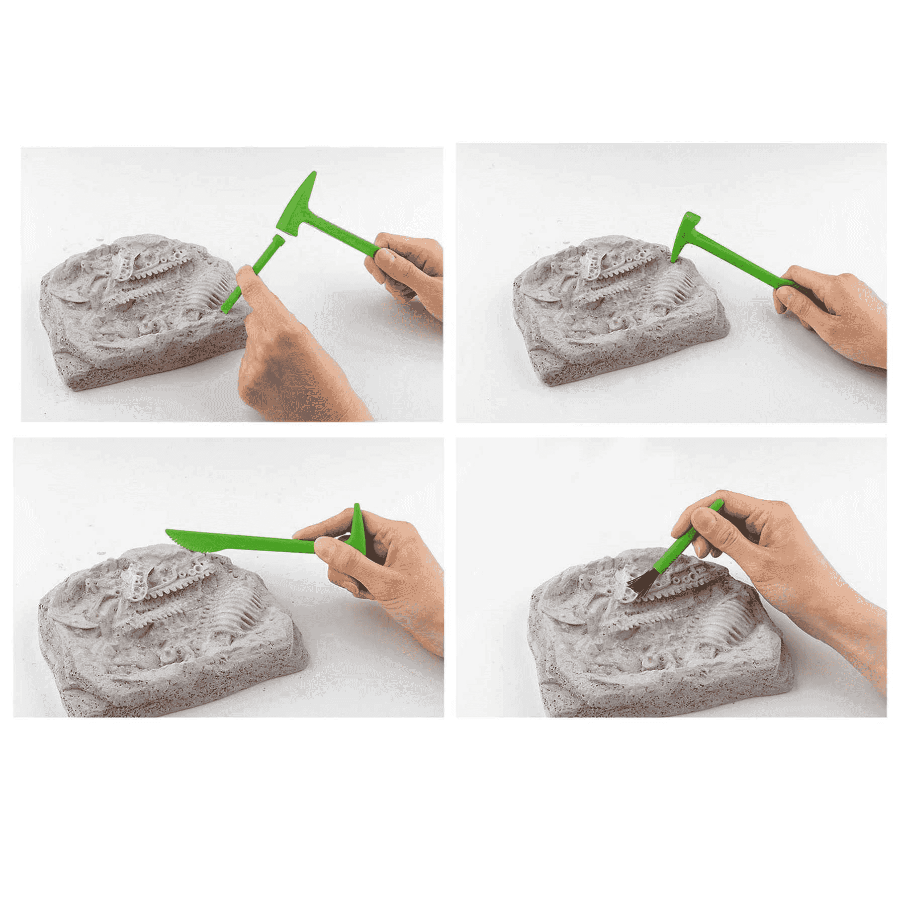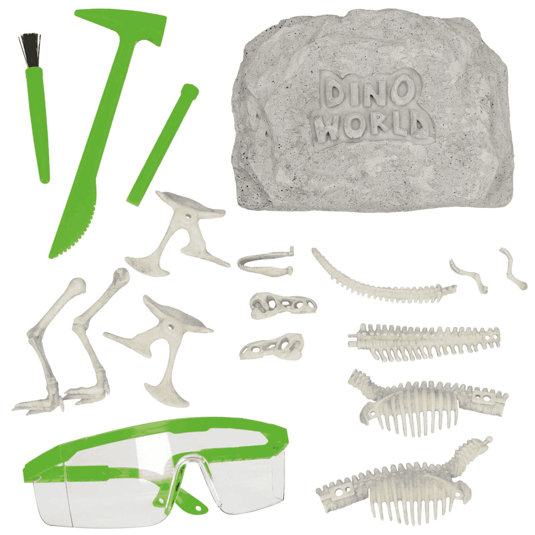 El set incluye todo lo que necesitas para excavar el esqueleto de un dinosaurio: picoleta, cincel, pincel y gafas de seguridad.