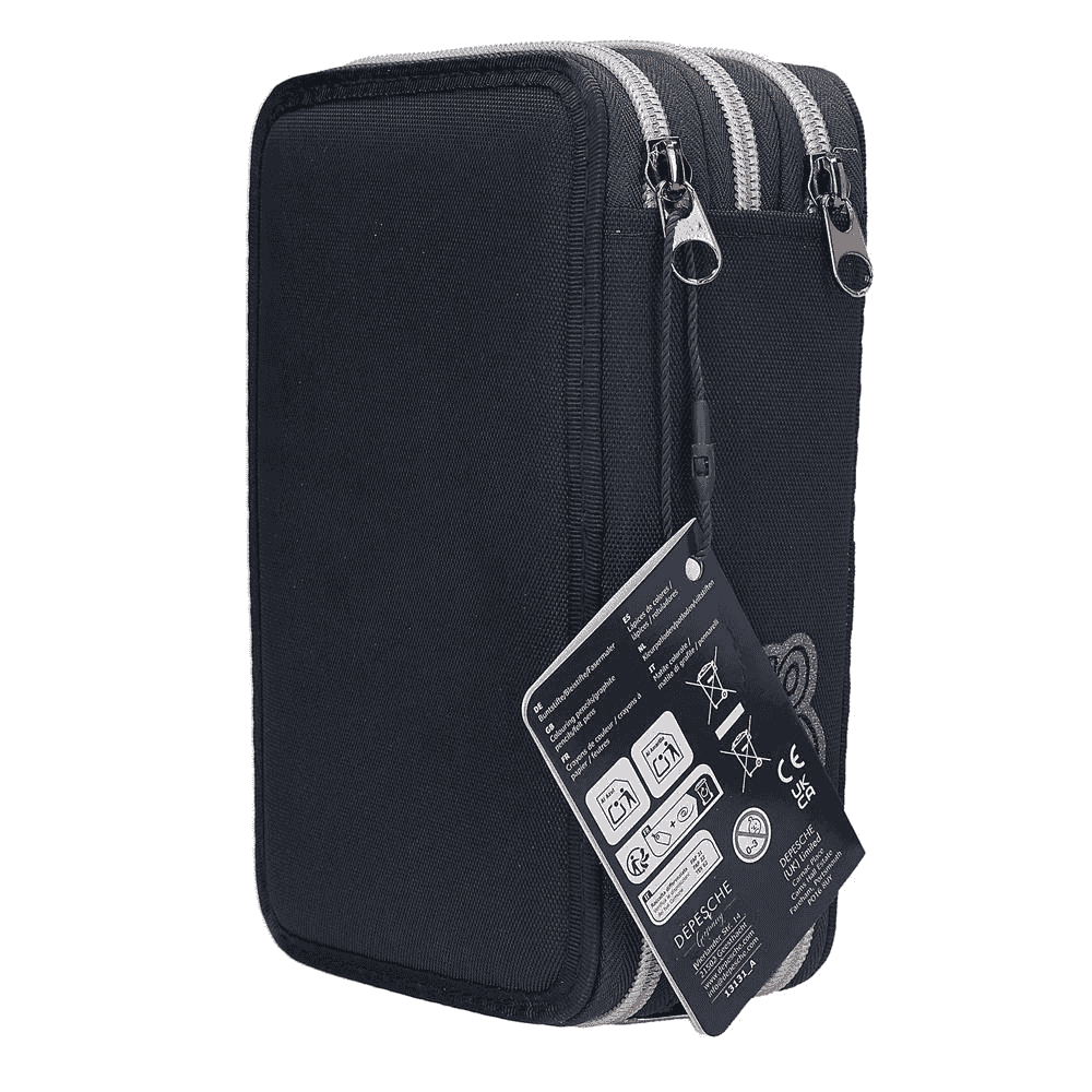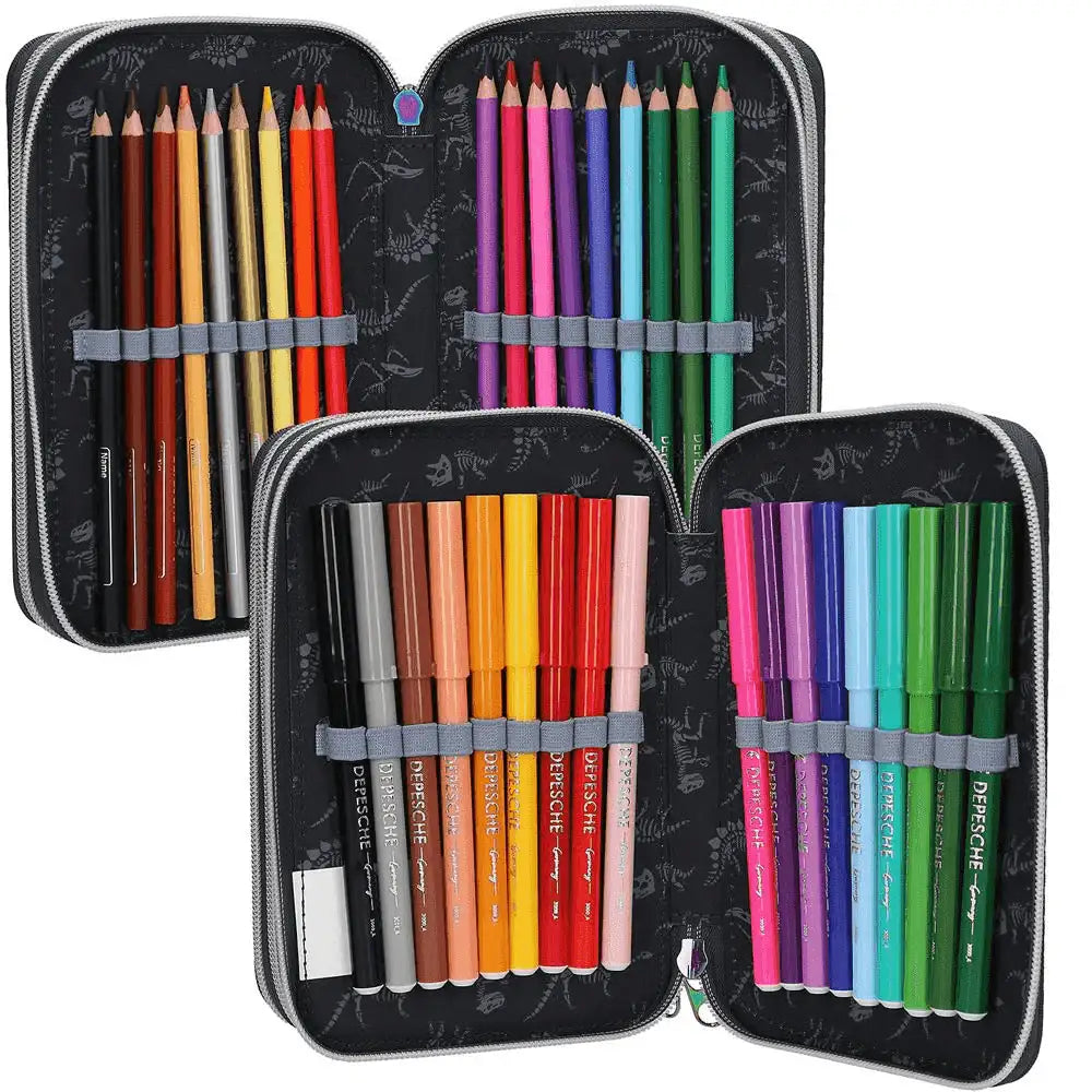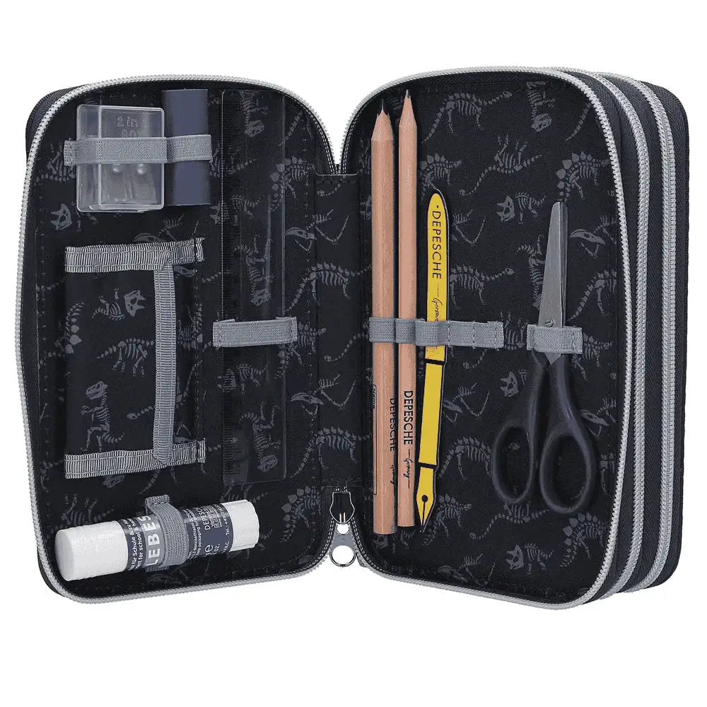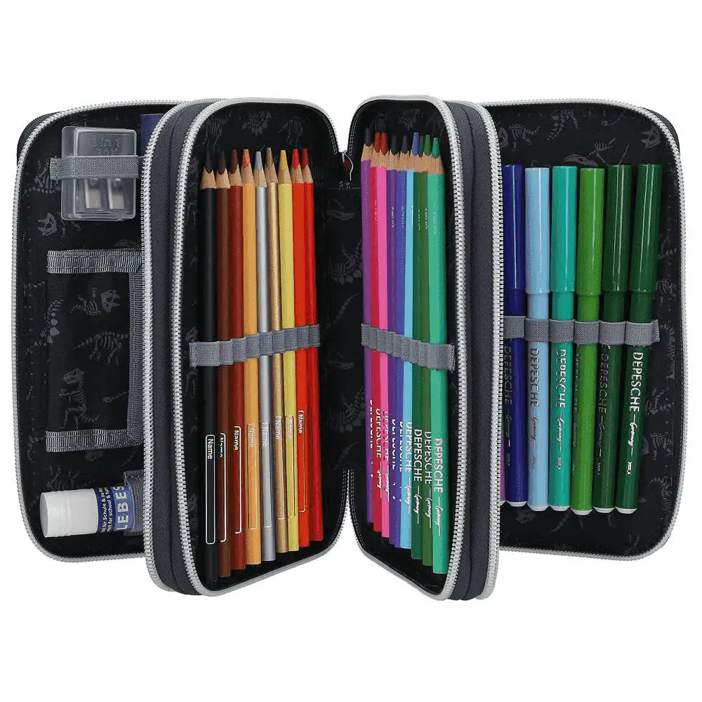 Descripción del producto: Galácticamente chulo. Este estuche azul marino de Dino World destaca por el genial diseño de dos temibles tiranosaurios rex sobre fondo de galaxias. Lo mejor: Al presionar el botón 'start' se ilumidurante 20 segundos aprox. los ojos y las fauces de los dinosaurios, así como los planetas. Los tres compartimentos separados vienen completamente llenos con 18 lápices de colores, 18 rotuladores, 2 lápices, sacapuntas, goma de borrar, regla, tijeras y pegamento en barra; el estuche también viene provisto de un pequeño bolsillo con cierre de velcro. Material: poliéster 100 por 100.