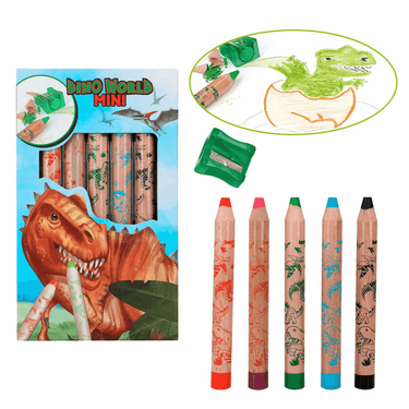 Los 5 lápices gruesos para colorear de Dino World Mini de color naranja, fucsia, verde, azul y negro son ideales para las pequeñas manitas creativas. Con monísimos motivos allover en el mismo color de cada lápiz. El set incluye el sacapuntas adecuado para afilar los lápices. en un caja transparente con cierre de clip que incluye instrucciones ilustradas. ¡Para pasar las cuentas y pasárselo en grande!