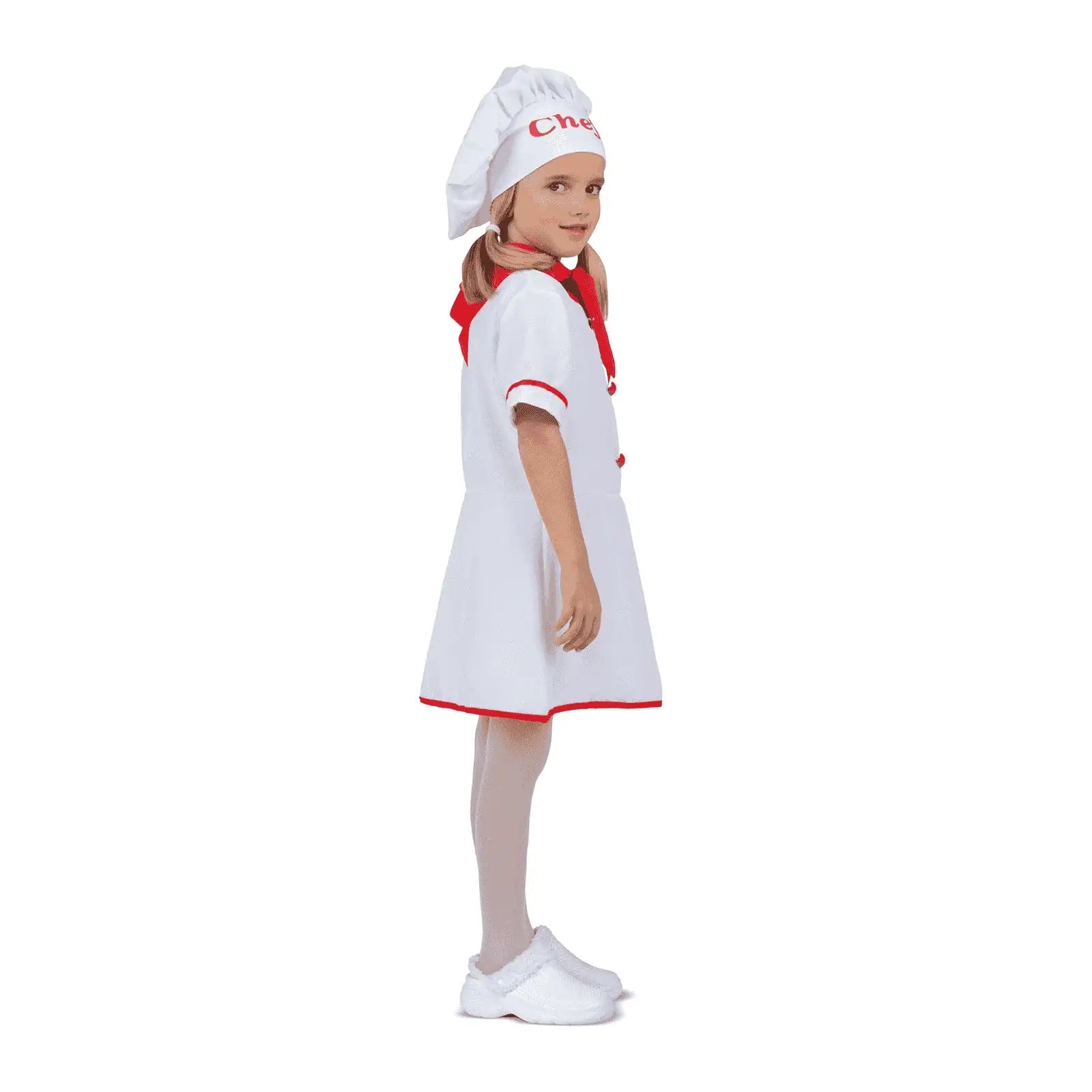 Incluye: disfraz de cocinera blanco-rojo talla 7-9 años compuesto por gorro, pañuelo y vestido. Resto de complementos no incluidos.