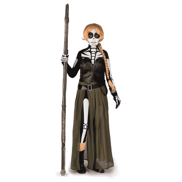 ¿Qué incluye? incluye camiseta esqueleto, guantes, cubrebotas, leggings, cinturón, corpiño, 2 brazaletes, falda, peluca, 2 sets de tattoos, esponja, maqui llaje blanco y maquillaje negro.