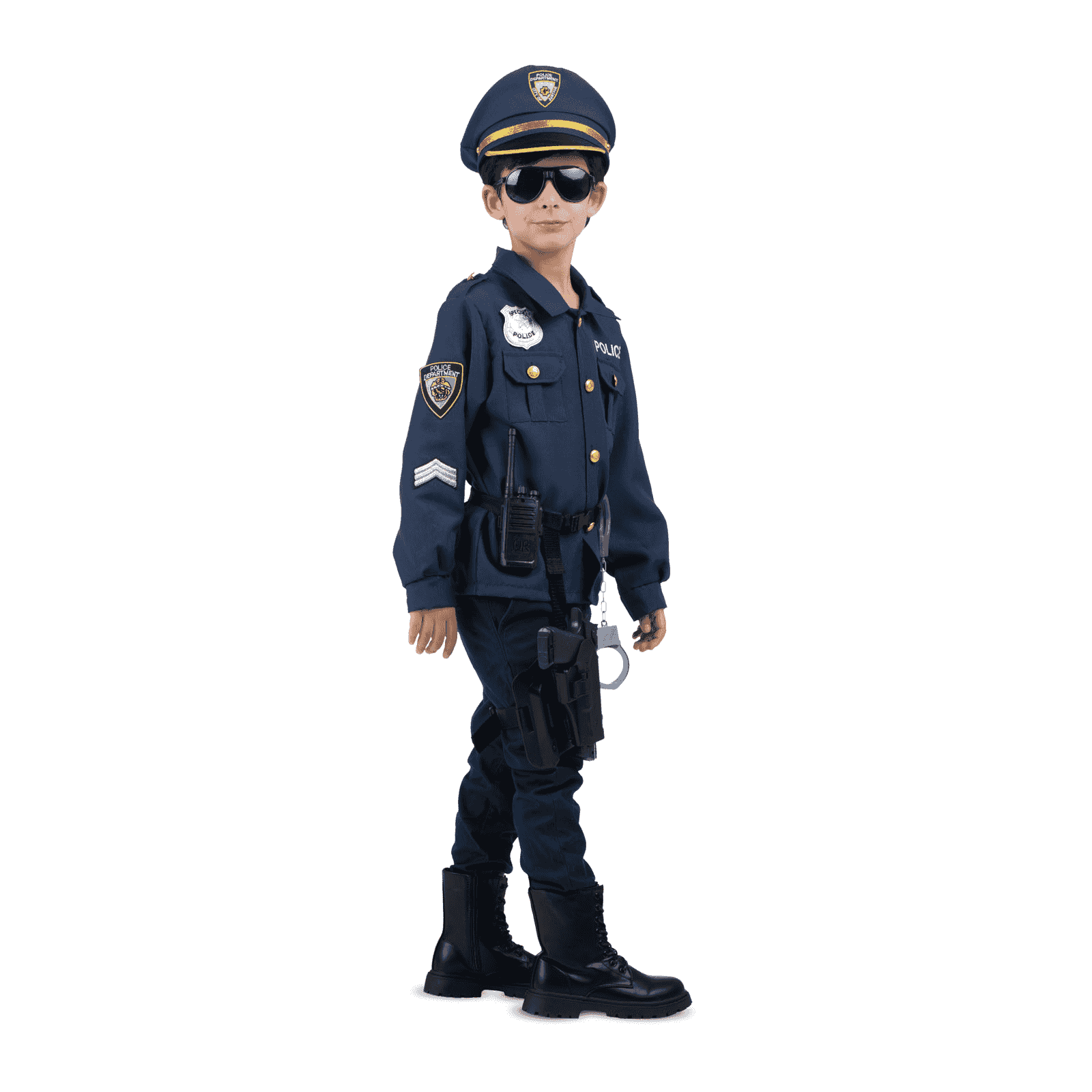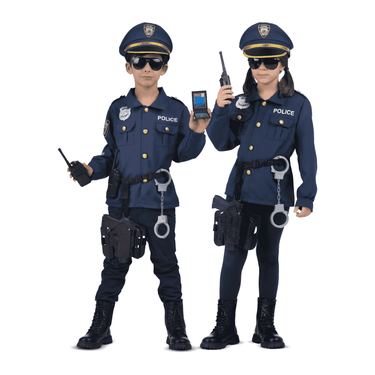 ¿Qué incluye? incluye gorra, chaqueta, esposas, walkie-talkie, gafas, pistola, placa de policía y pistolera.