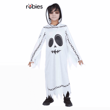 El Disfraz Fantasma Encadenado es una opción perfecta para que los niños se diviertan en Halloween o en cualquier fiesta temática de terror. Este disfraz incluye una túnica larga con capucha que simula a un aterrador espíritu encadenado, con detalles impresos de cadenas que completan el look espeluznante. Es ideal para los pequeños que quieren causar miedo y destacar en cualquier evento.