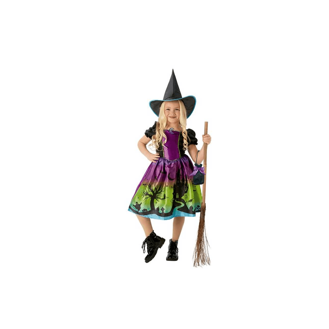 - Incluye: 1 disfraz de brujita luna negra con vestido, sombrero y bolso.