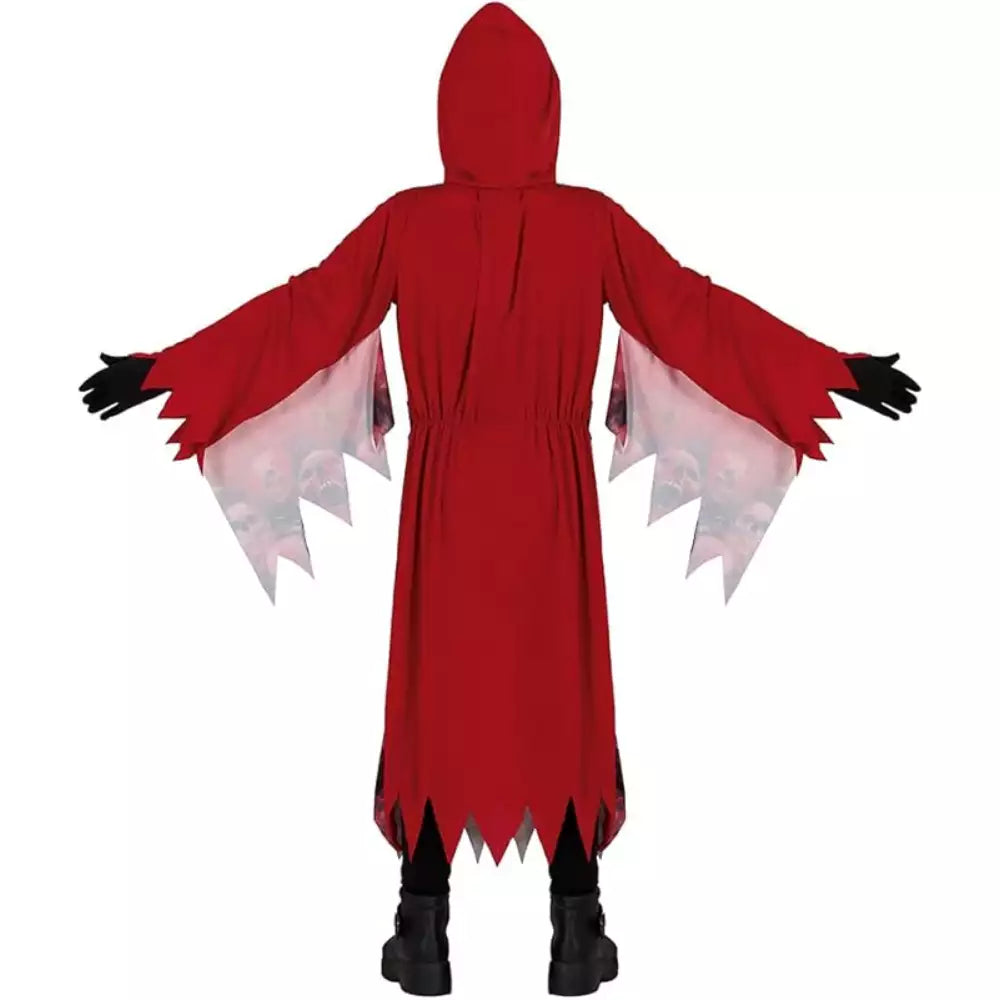 Un disfraz original, cómodo y terrorífico que mezcla el estilo clásico de la Parca con un giro sorprendente en rojo. Ideal para los peques que quieren destacar y disfrutar de la fiesta.