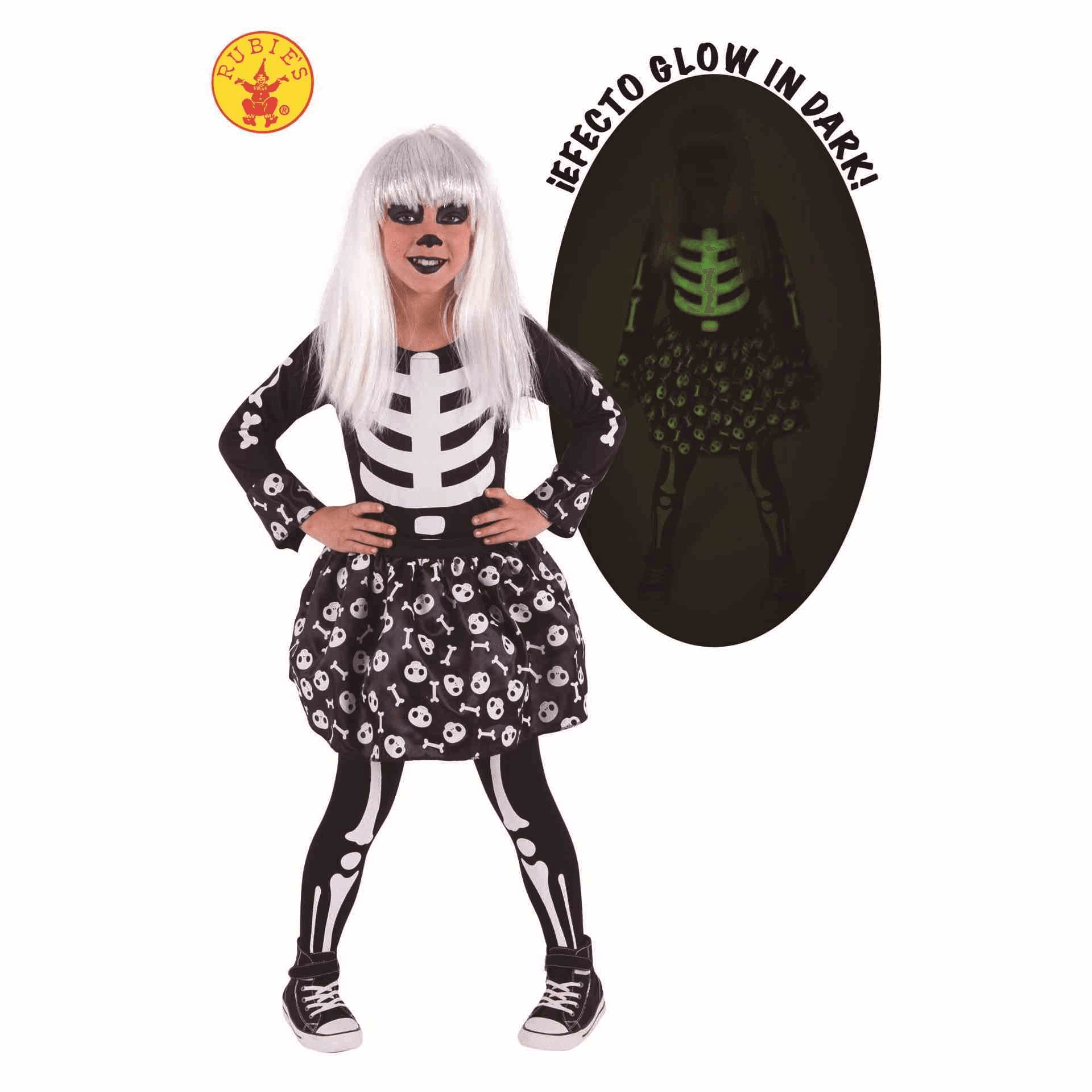 El Disfraz de Skeletita Glow in the Dark para niñas de 5 a 7 años es perfecto para las celebraciones de Halloween o cualquier evento de disfraces. El disfraz incluye un mono negro con un diseño de esqueleto que brilla en la oscuridad, lo que lo convierte en una opción única y divertida para las fiestas nocturnas.