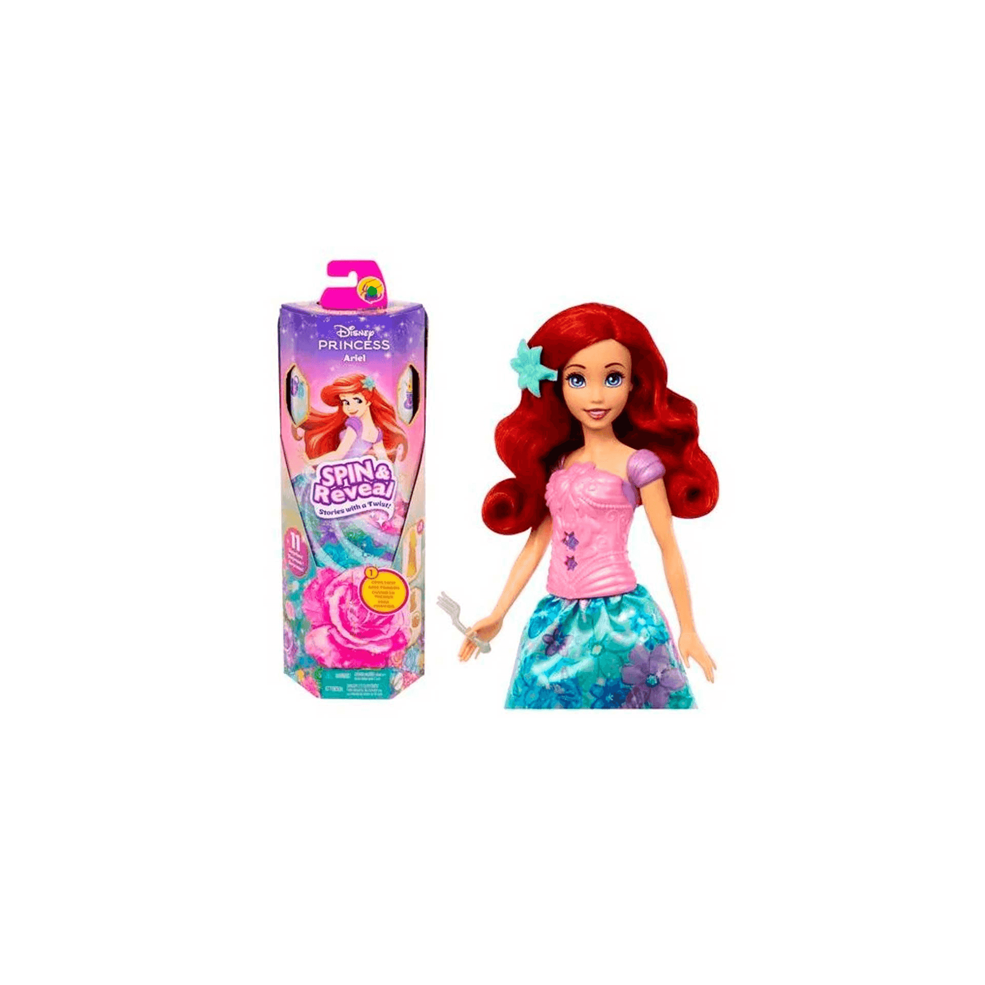 La muñeca Disney Princess Spin & Reveal Ariel ofrece una experiencia de unboxing mágica que encantará a los pequeños fans de ´La Sirenita´. Comienza abriendo la flor para revelar una escena de juego con siluetas misteriosas. Luego, gira el paquete para descubrir las sorpresas que contienen accesorios y pegatinas. El toque final es una muñeca de Ariel en un hermoso atuendo floral, lista para nuevas aventuras.