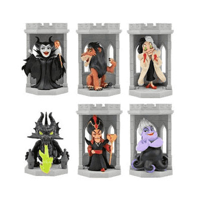 Este BlindBox incluye gráficos y detalles que representan a villanos icónicos de Disney dentro de castillos o marcos evocadores, como Maléfica, Scar, Cruella o Úrsula, por mencionar algunos. Su formato transparente e ideal para coleccionar permite que cada figura sea parte de historias imaginativas y decoraciones con estilo.