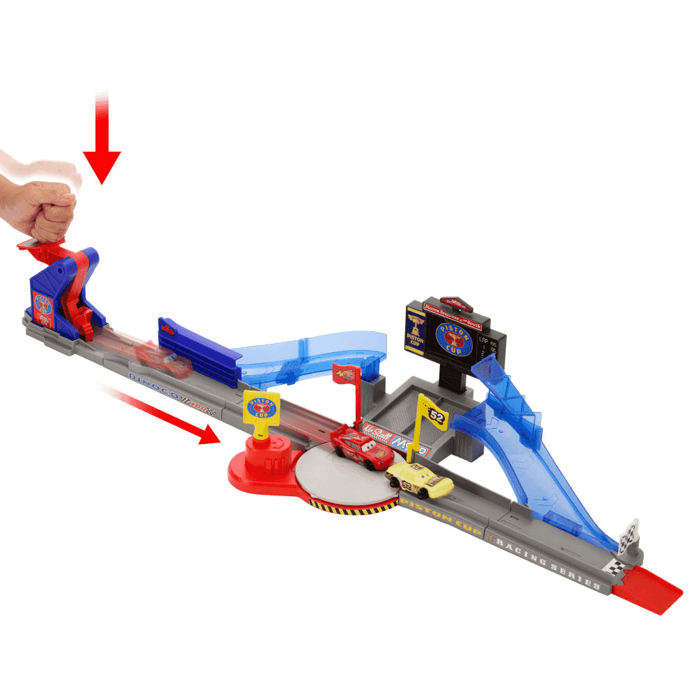 Revive la mítica carrera de apertura de la película original de Disney y Pixar Cars con el espectacular conjunto de juego Pista de Carreras Acrobáticas Copa Pistón. Un set lleno de acción que permite a niños y niñas recrear escenas icónicas o inventar nuevas competiciones a toda velocidad.