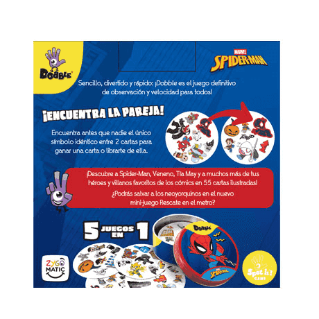 Gracias a su formato compacto y a sus reglas sencillas, Dobble Spider-Man es perfecto tanto para introducir a los más pequeños en los juegos de mesa como para disfrutar de un juego ágil entre generaciones, en cualquier momento y lugar.