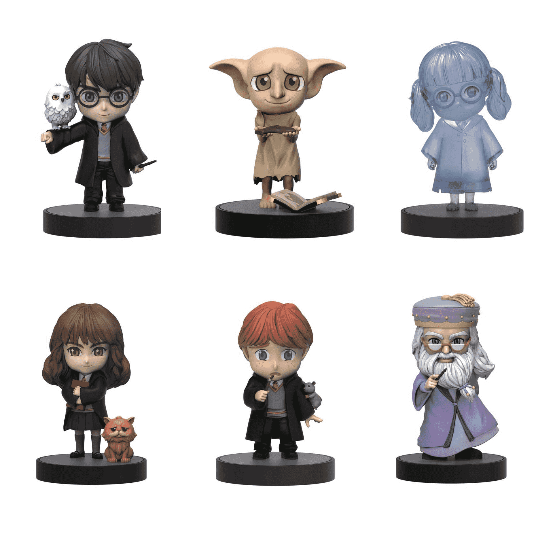 - Modelos surtidos: incluye personajes como Harry Potter, Hermione Granger, Ron Weasley, Albus Dumbledore, Dobby y más.