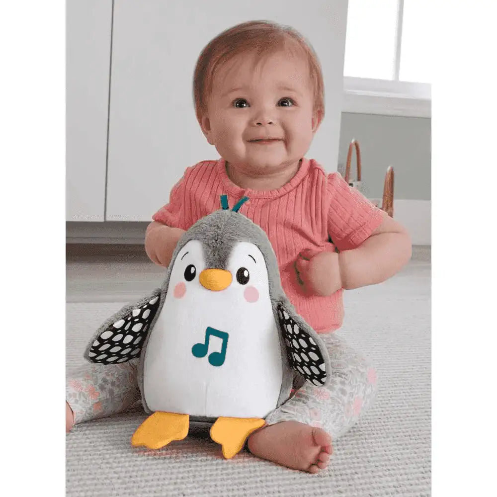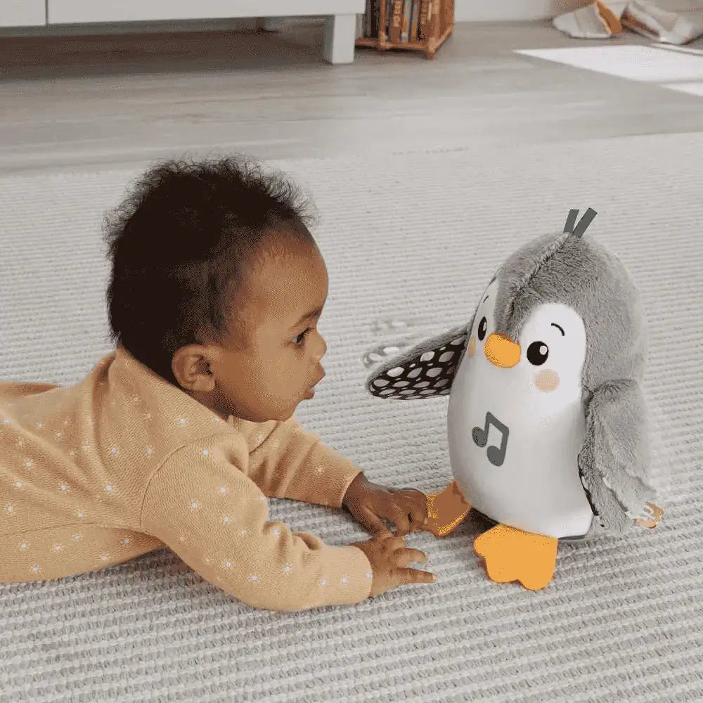 Jugar boca abajo es más divertido con el peluche musical Pingüino Aleteos y tambaleos de Fisher-Price. Este simpático peluche para jugar boca abajo reacciona con divertidos aleteos y música cuando el bebé lo toca. A medida que el bebé crezca, la base tambaleante del pingüino animará al bebé a sentarse y dar golpecitos a su amigo para escuchar más melodías y disfrutar de más tambaleos y aleteos. Los estampados en blanco y negro de gran contraste, el suave tejido de peluche, los pies que crujen al arrugarlos y la música alegre ayudan a estimular el desarrollo de la vista, el tacto y el oído del bebé recién nacido.