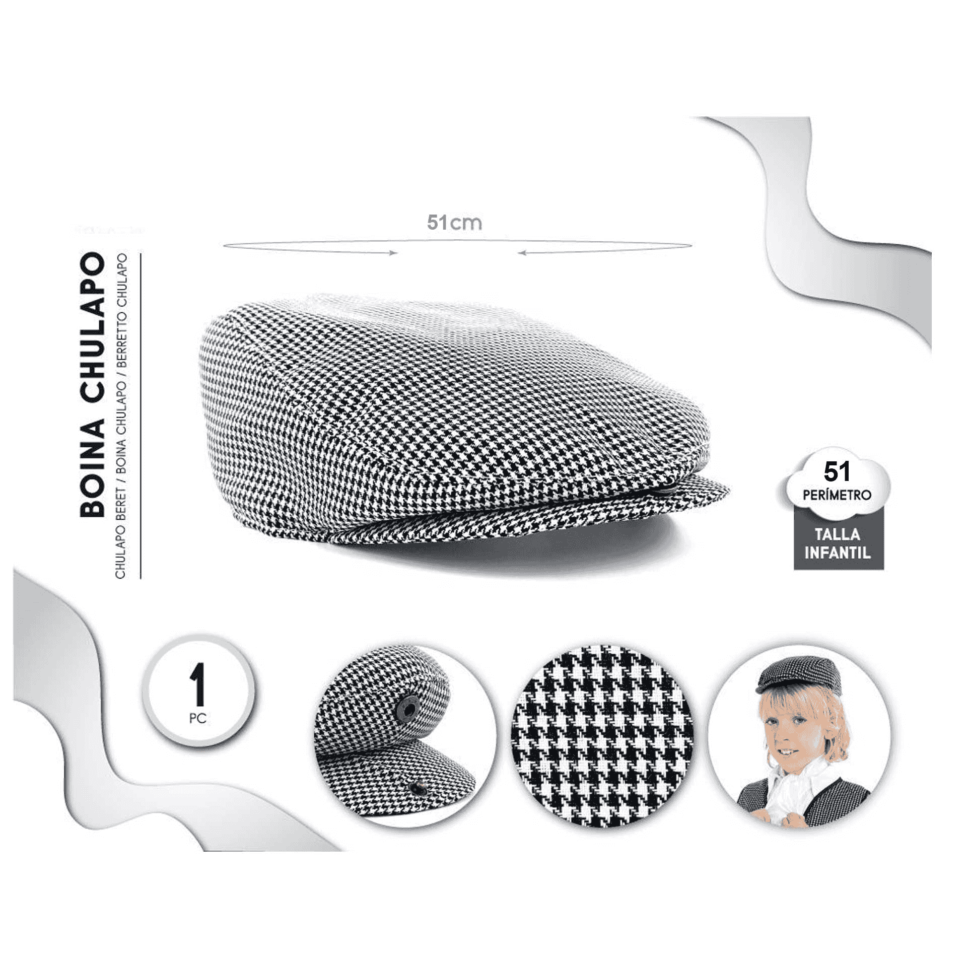 Con la Gorra Chulapo Talla 51, los más jóvenes de la casa podrán participar en fiestas y eventos tradicionales con un look castizo de lo más auténtico. Inspirada en el estilo madrileño más clásico, esta gorra es perfecta para completar un disfraz de chulapo y destacar en cualquier verbena, desfile o celebración escolar.