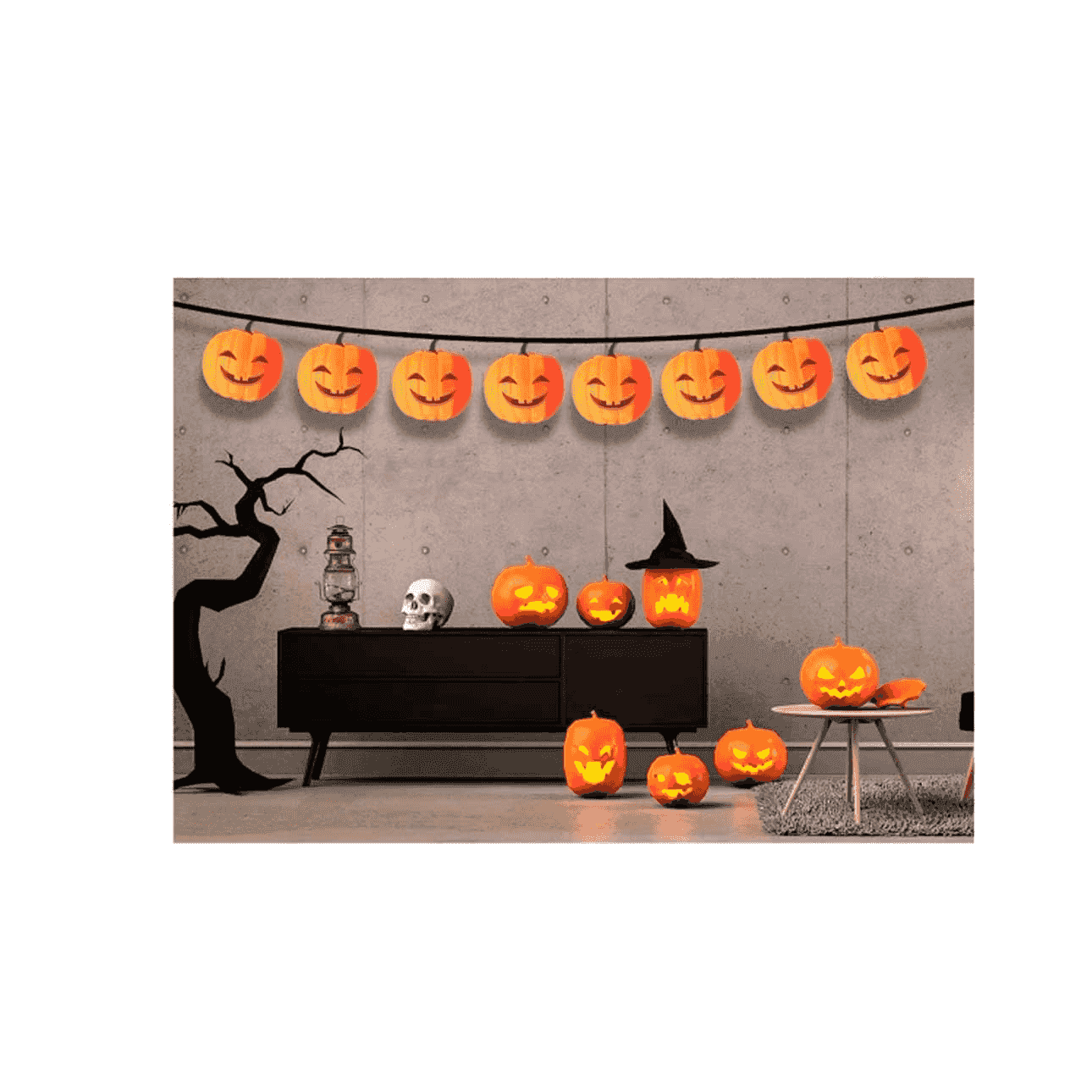 La guirnalda presenta encantadoras calabazas naranjas que son ideales para crear un ambiente festivo y alegre en tu fiesta de Halloween. Cuelga esta guirnalda en las paredes, en la puerta principal o en cualquier lugar que desees decorar. Su diseño alegre es perfecto para fiestas infantiles, eventos escolares y celebraciones en el hogar.