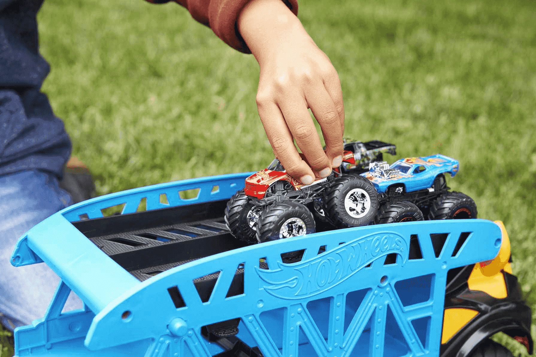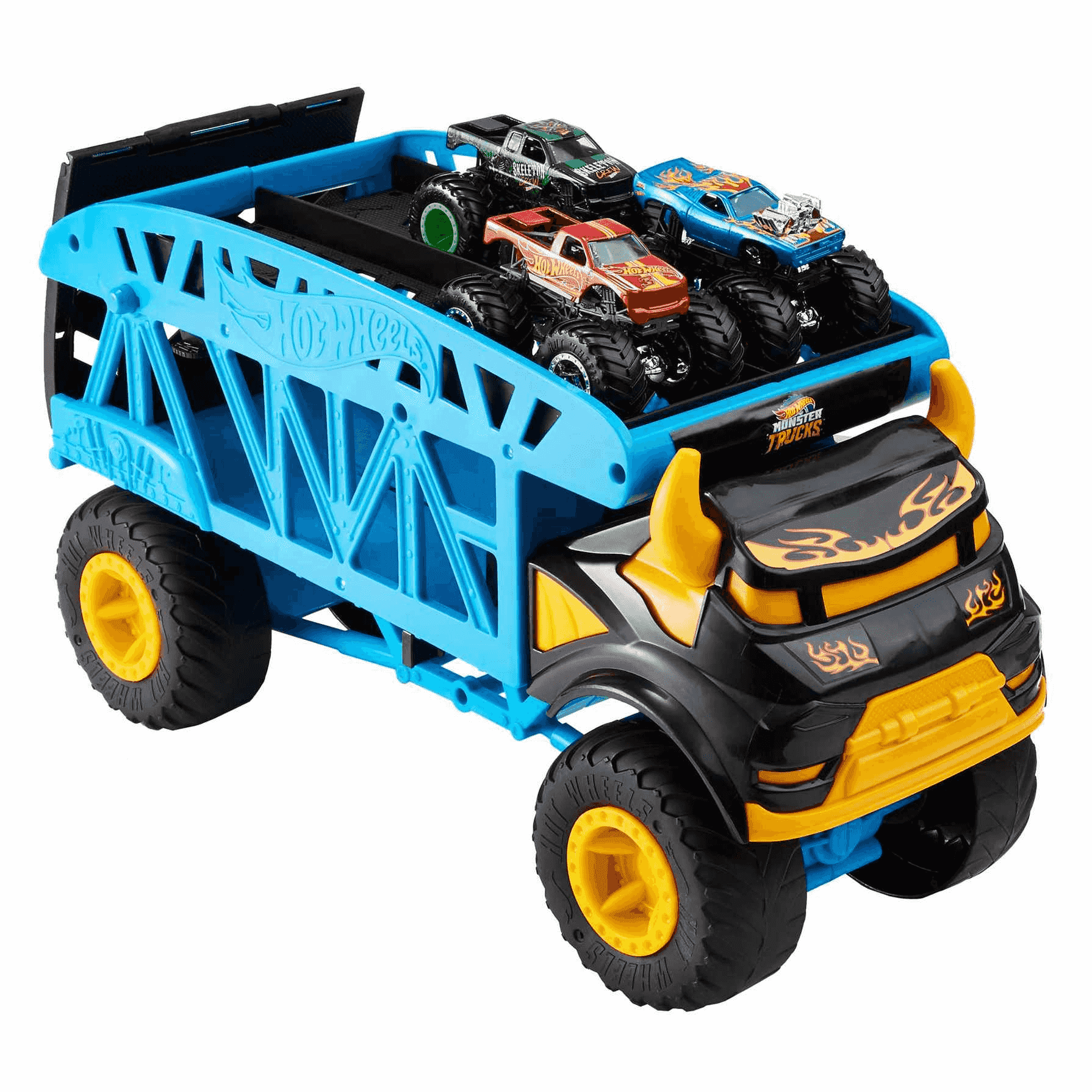 Hot Wheels Monster Trucks Camión Monster Mover Vehículo transportador de coches, incluye 3 coches de