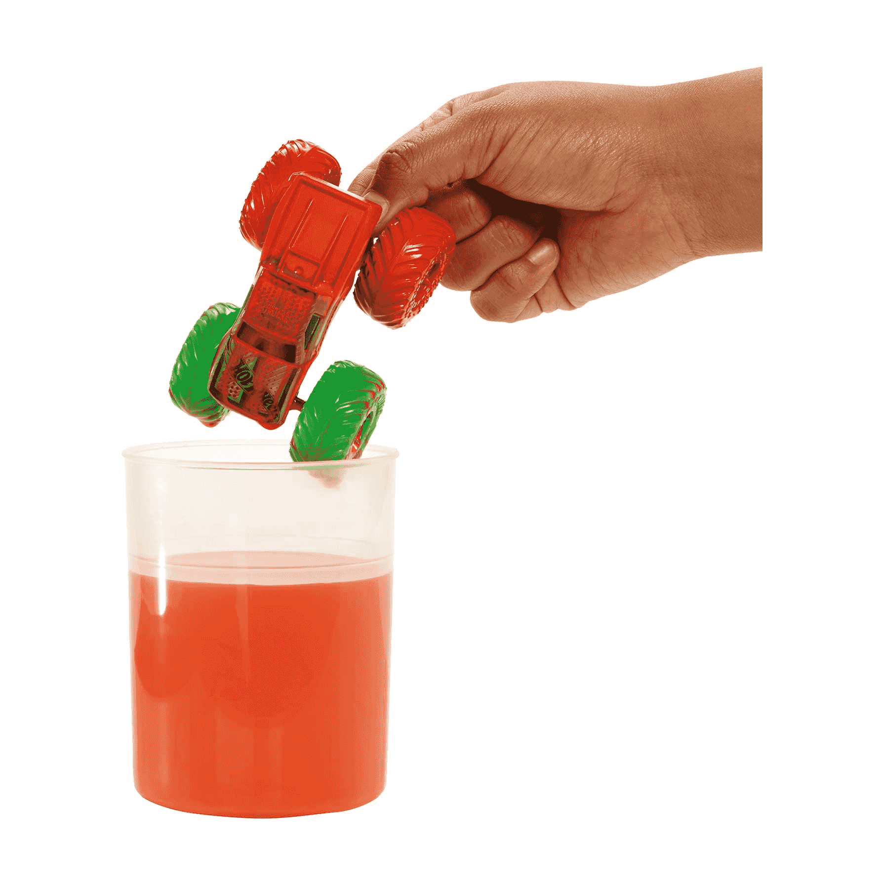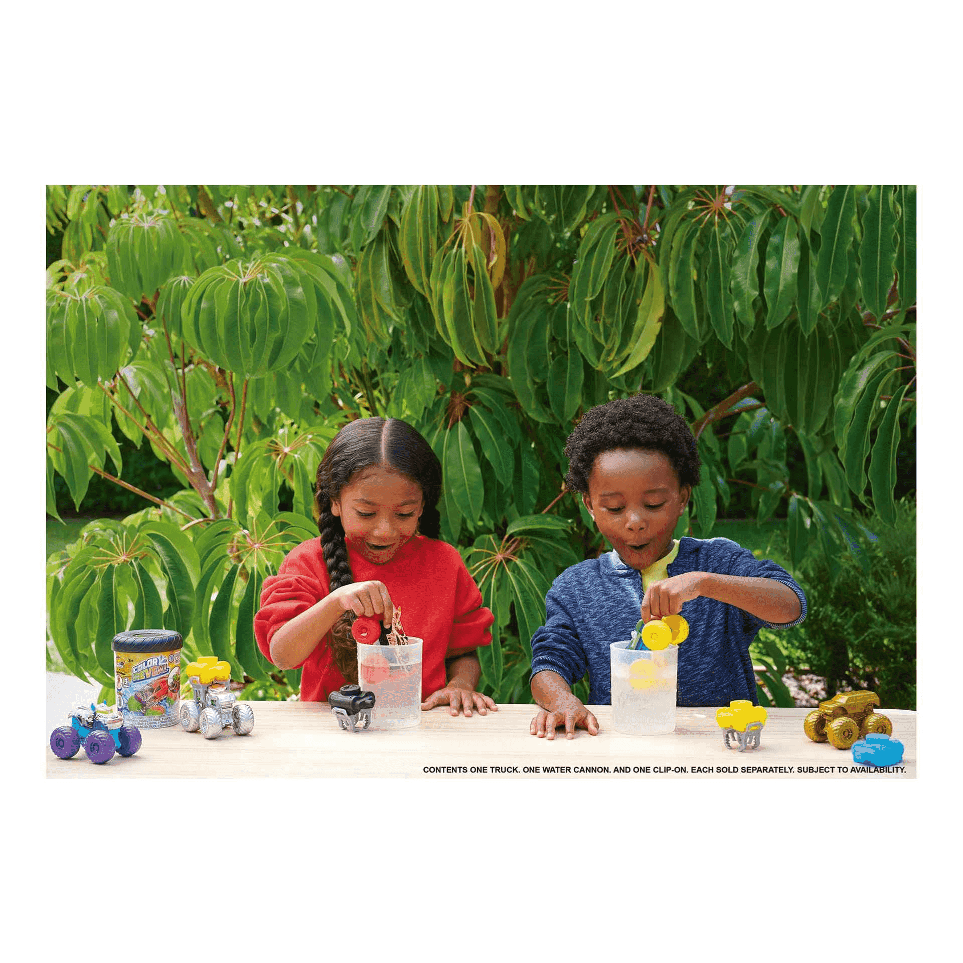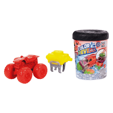 ¿Quieres saber que modelo te ha tocado? Llena el tambor con agua y remoja el camión hasta que el agua cambie de color. ¡Luego, sácalo para revelar el nuevo color del Monster Truck! El modelo que te toque es sorpresa.