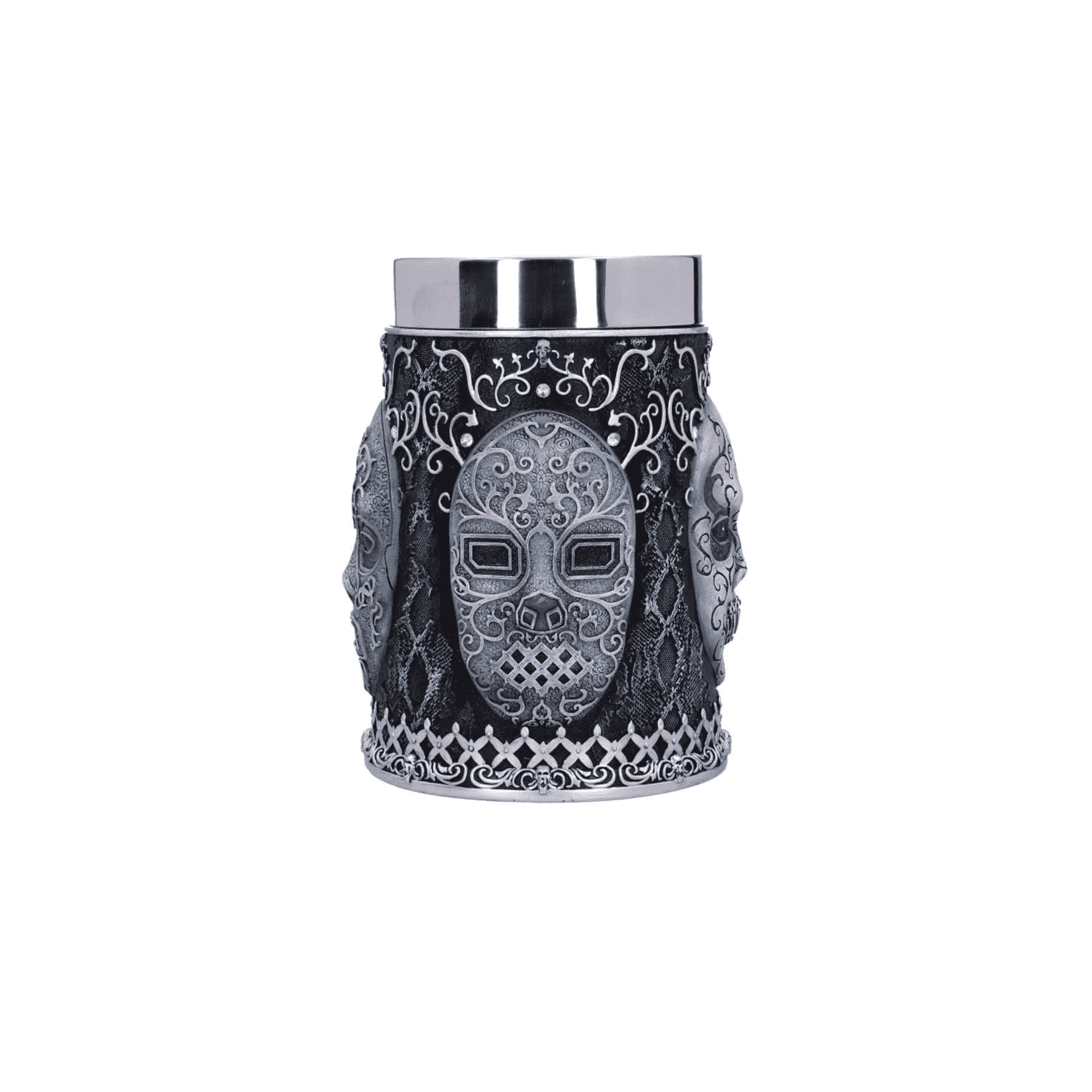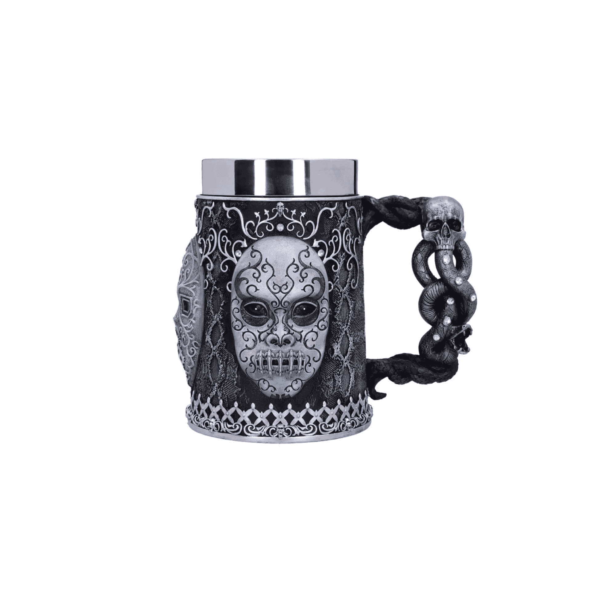 - Diseño detallado: Decorada con la icónica máscara de los Mortífagos y la Marca Tenebrosa, pintada a mano para un acabado único.