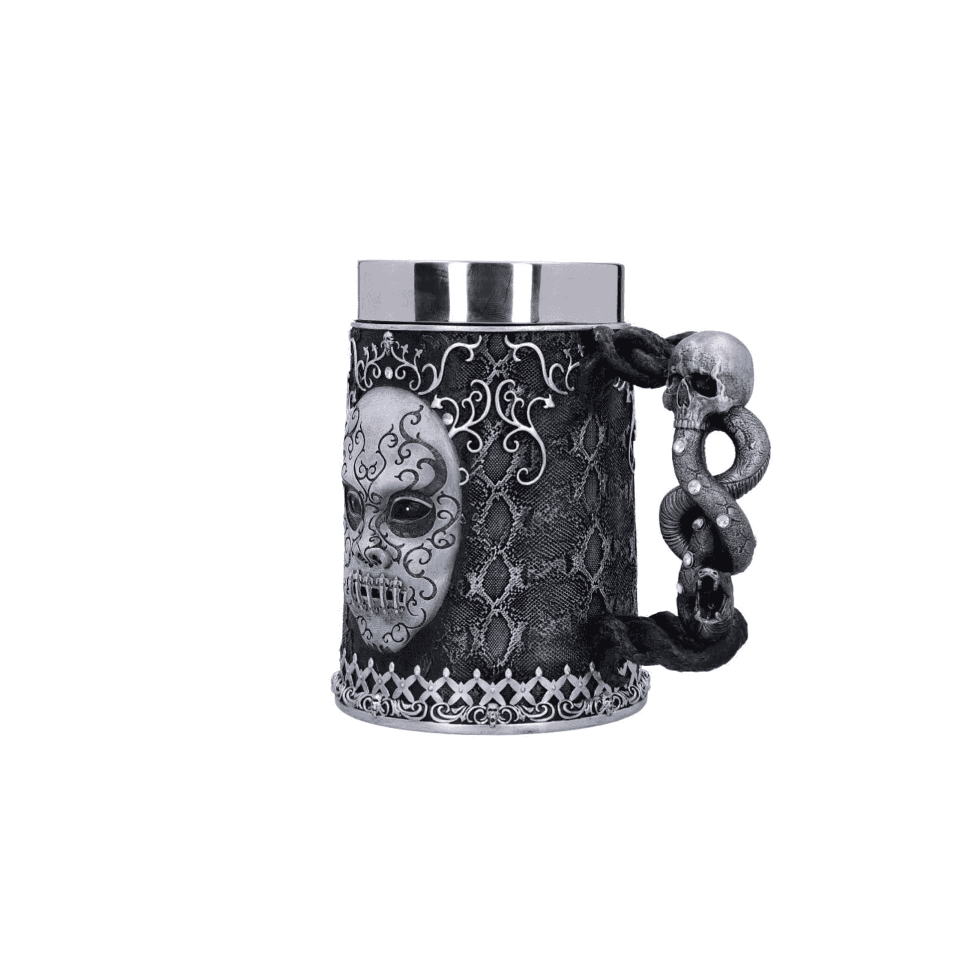 ¿Eres fan del lado más oscuro del mundo mágico? Con la Jarra de Cerveza Mortífago de Harry Potter, podrás mostrar tu lealtad a los seguidores de Lord Voldemort en cada brindis. Esta pieza coleccionable de 15,5 cm combina funcionalidad y diseño, siendo perfecta tanto para usar como para exhibir.