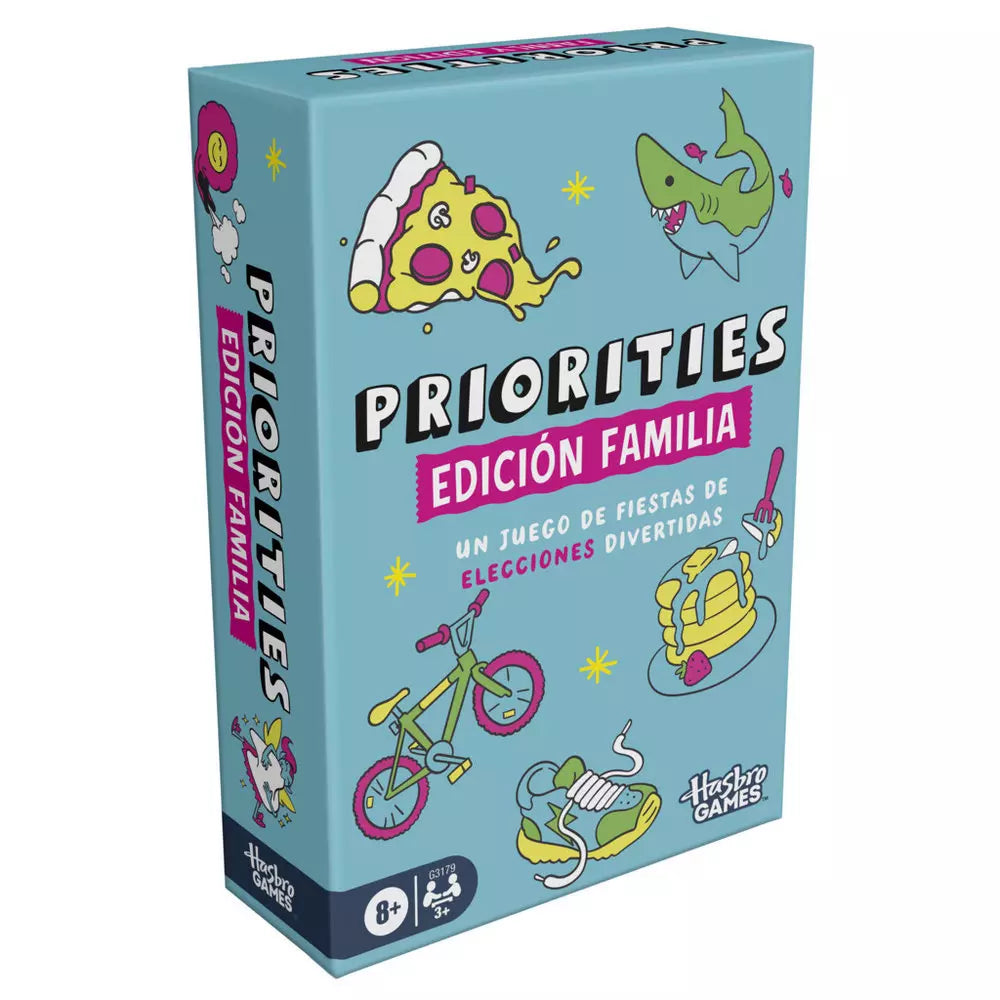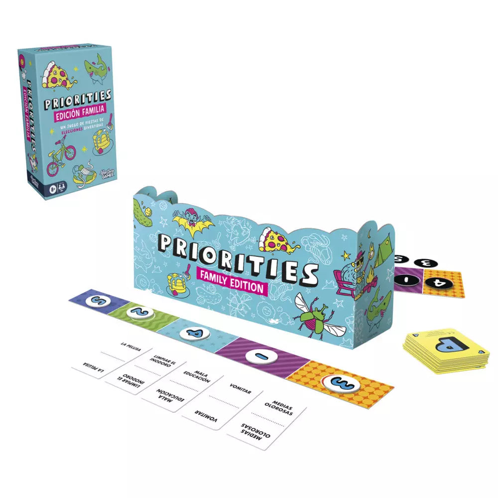 Priorities Family Edition de Hasbro es un juego de cartas pensado para convertir decisiones cotidianas en risas y debates en familia. En cada partida, un jugador toma el papel de Mandamás y ordena cinco cartas con objetos o situaciones según sus preferencias —desde “Amor absoluto” hasta “Odio eterno”— mientras el resto de jugadores colabora para adivinar ese orden. El objetivo es simple y divertido: acertar la clasificación, ganar cartas y ser el primero en deletrear PRIORITIES para alzarse con la victoria. Es una propuesta perfecta para noches de juegos, reuniones familiares y viajes donde quieres un entretenimiento rápido, social y lleno de conversación.