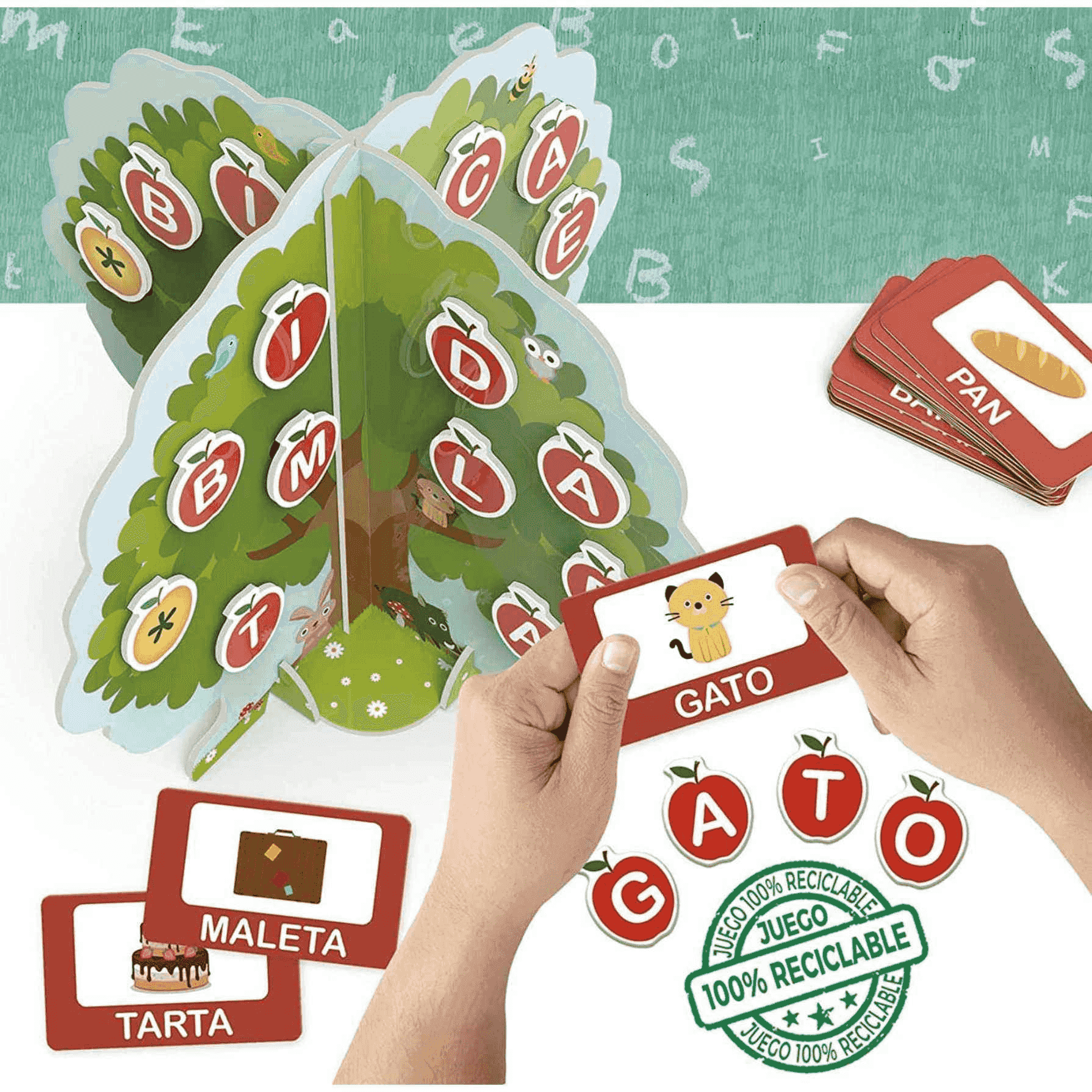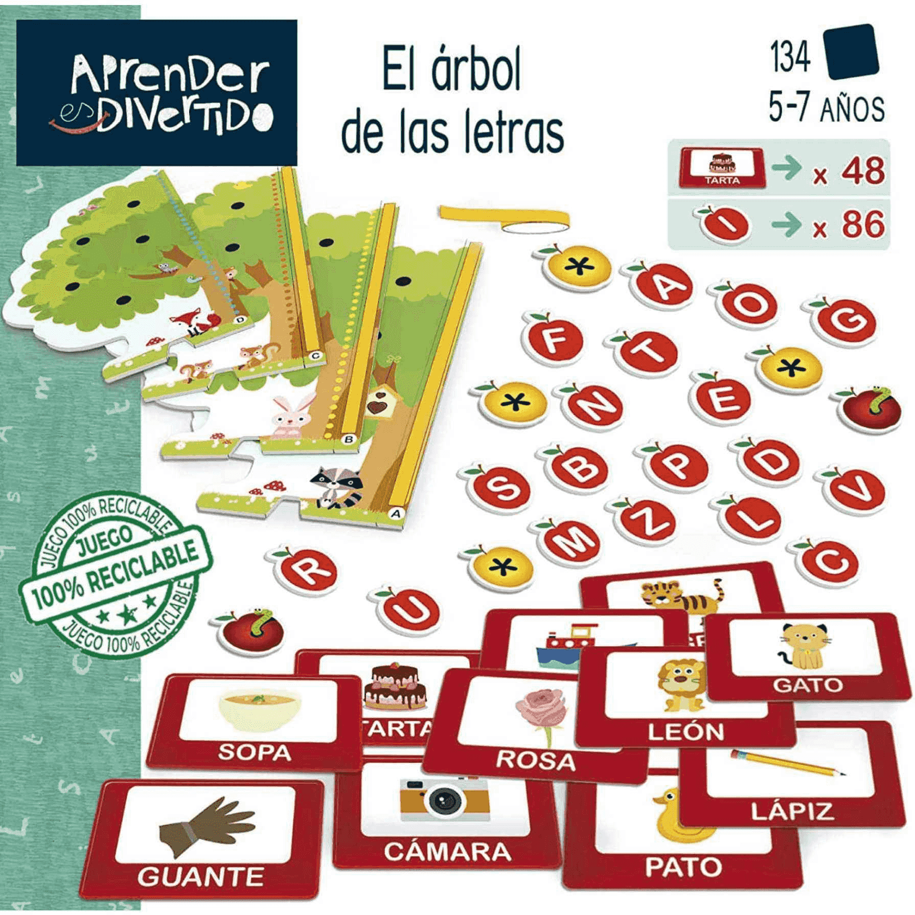 Contenido: 1 árbol de cartón en 3D (4 piezas), 1 rollo de cinta adhesiva a doble cara, 96 puntos de velcro, 86 manzanas de cartón, 48 tarjetas de palabras, instrucciones.