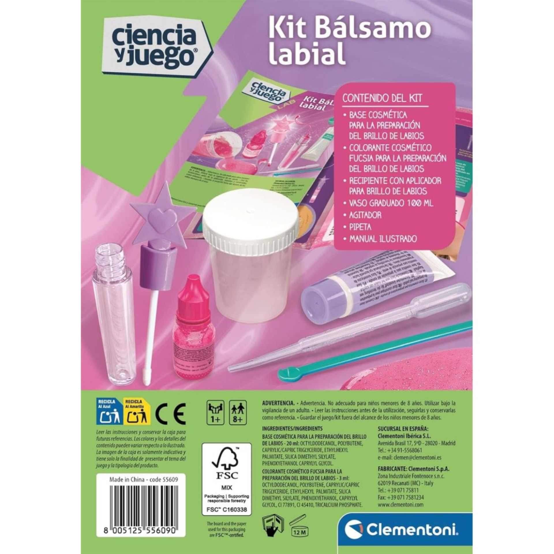 El Kit Bálsamo Labial de Clementoni es un laboratorio en miniatura para que niñ@s a partir de 8 años puedan fabricar sus propios bálsamos labiales con ingredientes naturales y seguros. Es un juego creativo y educativo que combina química, cuidado personal y autoexpresión.