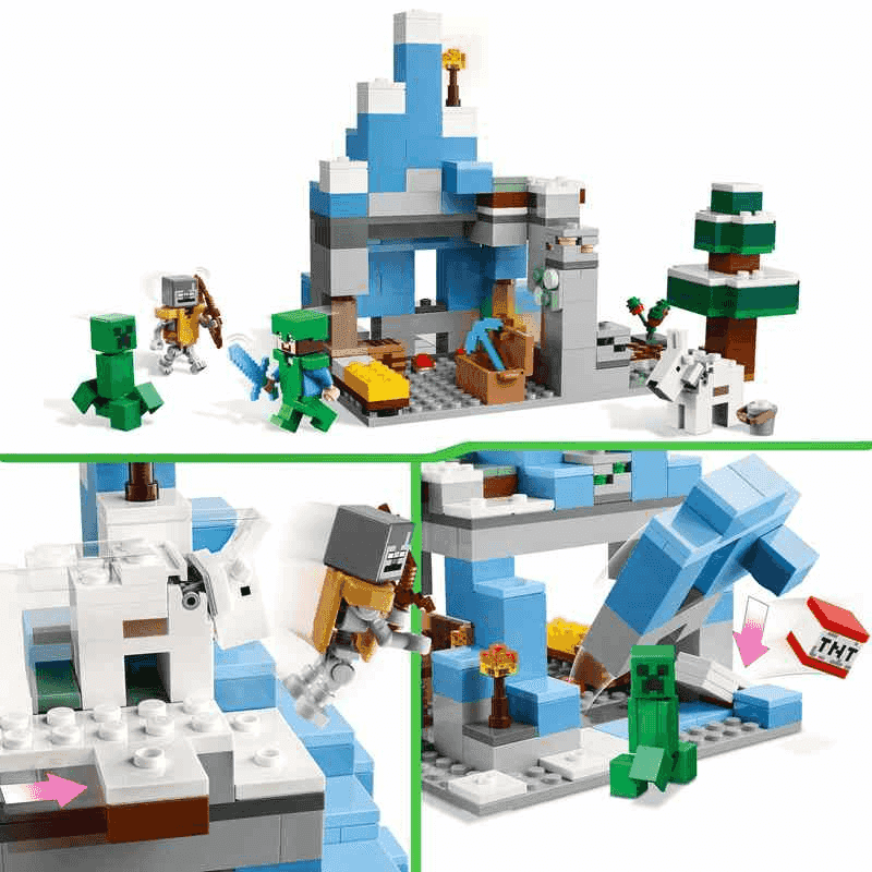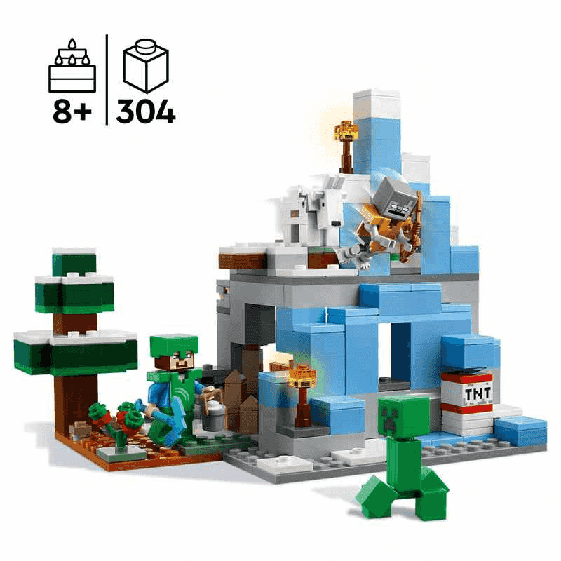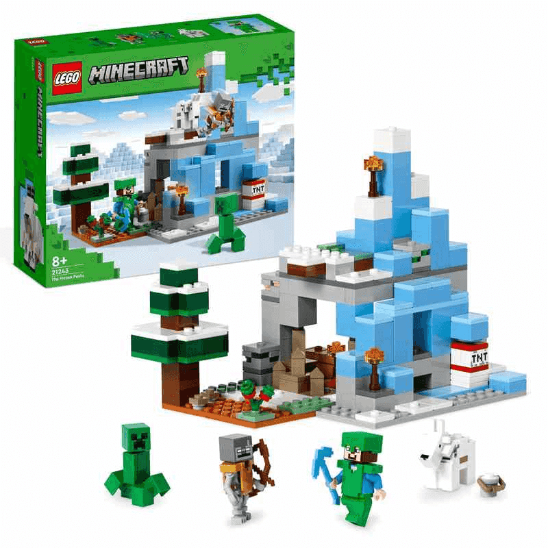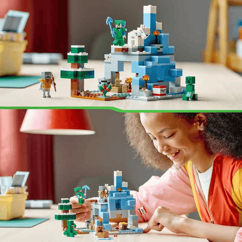 El set LEGO® Minecraft® Los Picos de Hielo (21243) viene lleno de elementos y funciones que reservan a los jugadores a partir de 8 años montañas de trepidante diversión al estilo Minecraft. ¡Construir, combatir, explorar y explosionar! Los jugadores de Minecraft reconocerán los Picos de Hielo y los bosques de la Taiga, y estarán deseosos de aplicar sus habilidades Minecraft para extraer las menas de carbón, hierro y esmeralda que se ocultan bajo la capa de suelo congelada. Los niños tendrán que construir un refugio seguro y reunir comida antes de empezar a extraer minerales. Cuando se les acerquen emblemáticas criaturas hostiles, como un Creeper y un errante, podrán escapar por la peligrosa cueva kárstica, volar la montaña en pedazos con el TNT para llegar al refugio, ¡o usar la función de embestida de la cabra para hacerlos caer por el acantilado! Y todavía les espera más diversión digital con las intuitivas herramientas de acercamiento, giro y visualización de la app LEGO Builder.