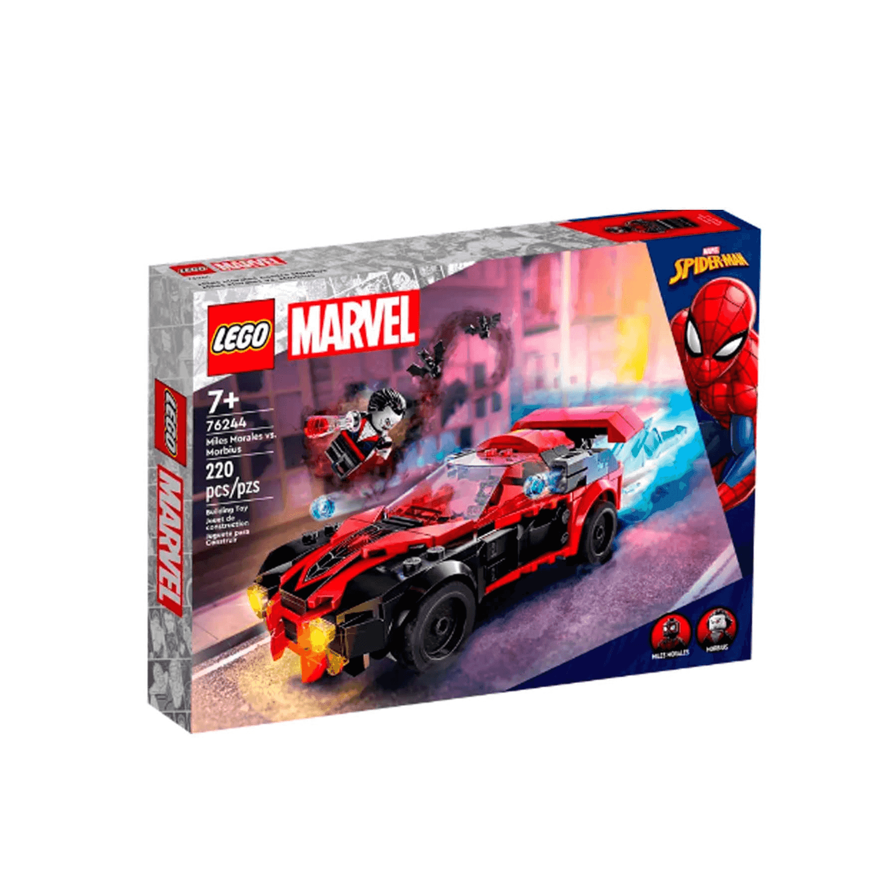 Pon un coche alucinante en las manos de tu peque mayor de 7 años y anímalo a correr aventuras en el universo Marvel con el trepidante set LEGO® Marvel Miles Morales vs. Morbius (76244). Juguete de construcción con Miles Morales Spidey ¡A los fans de Marvel les encantará este set lleno de acción a toda velocidad! Incluye minifiguras de Miles Morales y el villano vampiro Morbius, así como un coche de carreras y montones de accesorios de gran realismo. El supercoche cuenta con 2 cañones en la parte delantera y un enorme propulsor en la parte trasera que aporta más potencia cuando lo exige la situación. El set contiene también un elemento que representa una telaraña (servirá a Miles Morales para balancearse y enredar a sus enemigos) y un par de murciélagos que ayudarán a Morbius a llevar a cabo sus retorcidos planes. Además, la app LEGO Builder reserva a los niños más diversión digital con sus herramientas de acercamiento y giro, que les permiten visualizar su modelo mientras construyen.