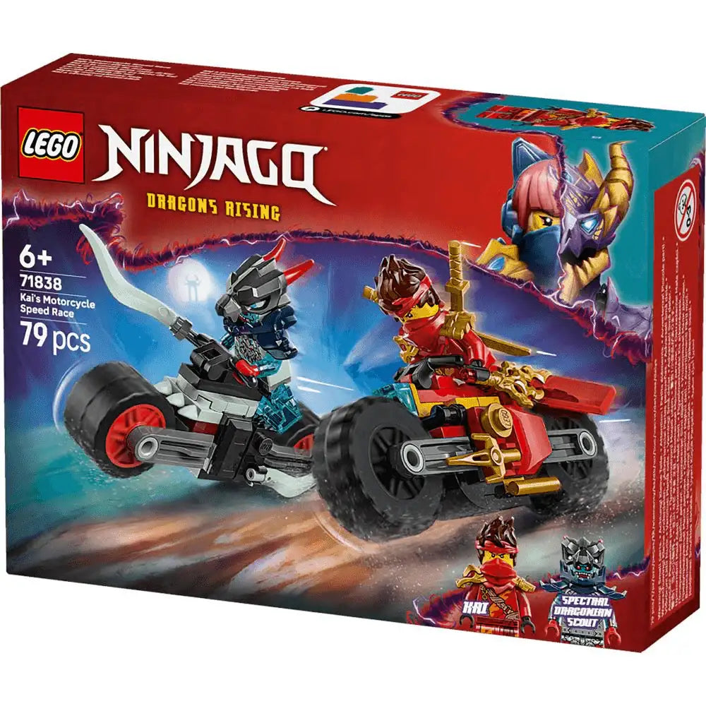 El juego Carrera Relámpago en Moto de Kai (71838) para niños y niñas a partir de 6 años les permite recrear trepidantes escenas de la temporada 3 de la serie para televisión NINJAGO: El Renacer de los Dragones. Este emocionante set cuenta con 2 motos ninja: la moto de carreras de Kai, adornada con 2 dagas, y la endiablada moto del infame explorador Dragónido Espectral. El set, además de los vehículos ninja, trae 2 minifiguras NINJAGO para pilotarlos: Kai (armado con una espada reveladora translúcida y 2 catanas doradas) y un explorador Dragónido Espectral (con una espada) para pasarlo genial imaginando batallas del bien contra el mal y jugando a solas o con amigos. Los sets y juguetes ninja LEGO NINJAGO construibles para niños incluyen dragones, vehículos y templos que les ofrecen la oportunidad de interpretar aventuras con sus héroes. Tu peque puede crear cada juego ninja con la app LEGO Builder, su guía en una intuitiva experiencia de construcción. El set contiene 79 piezas.