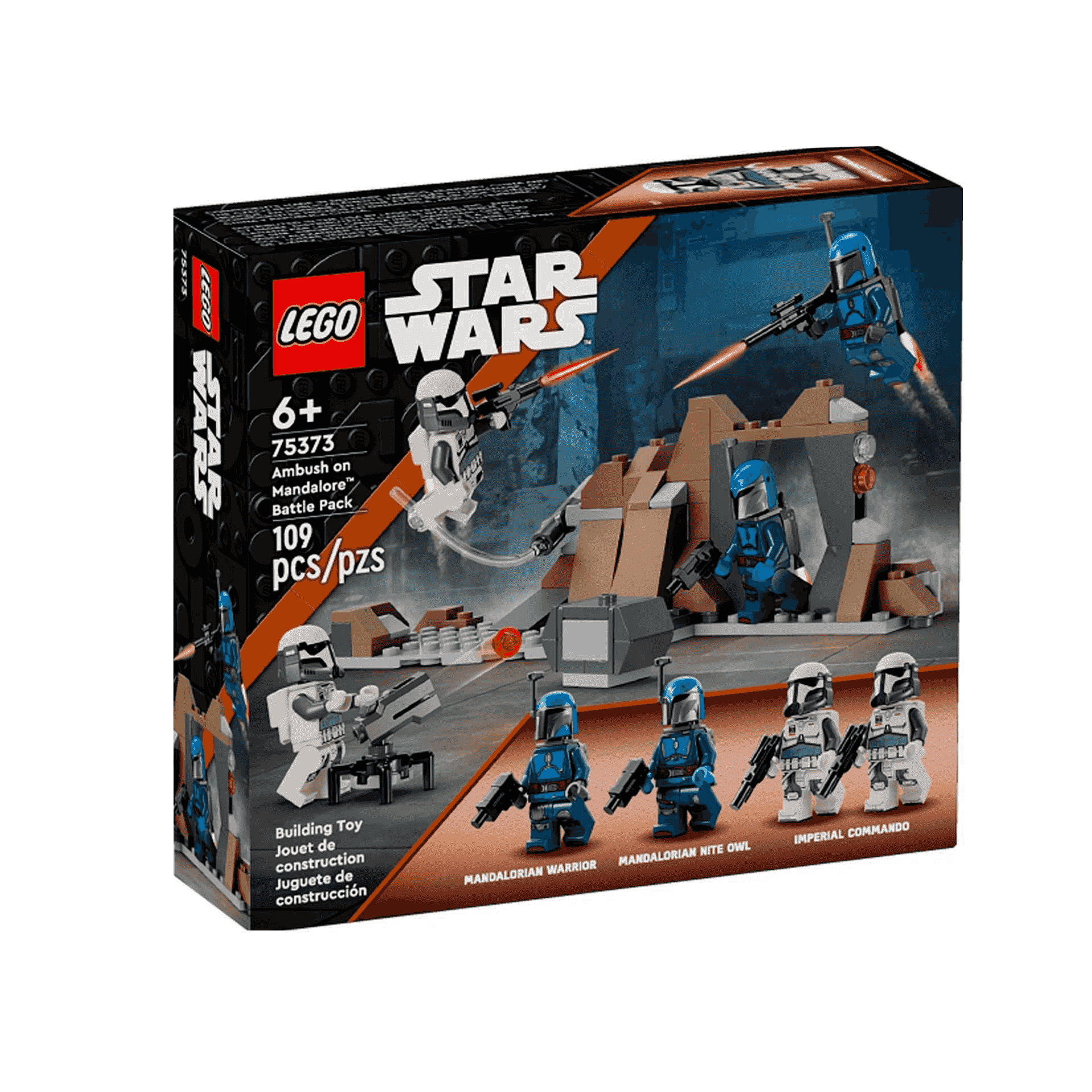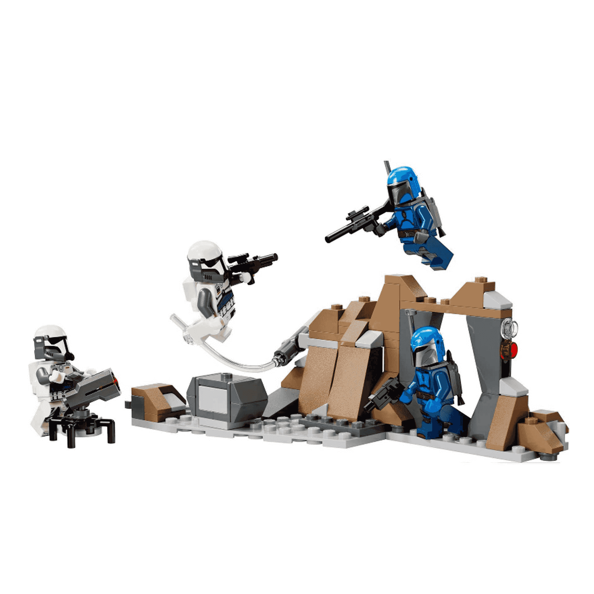 - 4 minifiguras LEGO® Star Wars™ coleccionables: Una integrante de los Búhos Nocturnos Mandalorianos y un guerrero Mandaloriano, con blásteres, y 2 comandos imperiales, con pistolas bláster, además de 4 elementos que representan mochilas propulsoras.